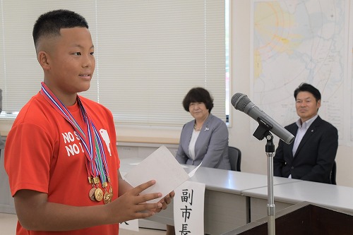 仁佐瀬恵汰(にさせけいた)さん(滝沢南中2年)が、全国大会に向けた決意を述べると、武田市長は、「1戦1戦大事にし、全力を尽くしてきてください。」と激励しました。