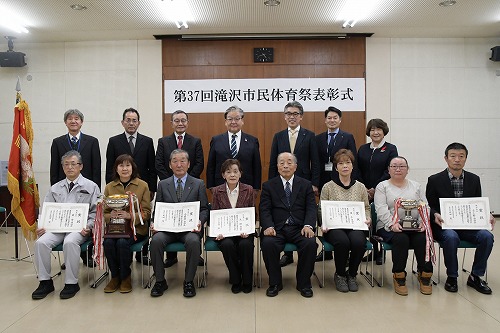 第37回滝沢市民体育祭表彰式が12月18日、市役所で行われ武田市長から優勝旗や賞状などの授与が行われました。