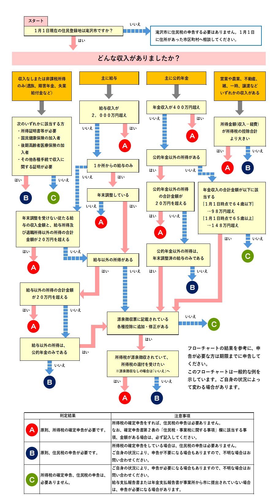 ホーム くらしの情報 届出・手続き 税金 あなたの申告は必要?フローチャートで確認しよう あなたの申告は必要?フローチャートで確認しよう ページID:03575 更新日: 2025年01月07日 申告フローチャート 申告をする必要があるかどうか、確認することができるフローチャートです。 フローチャートの結果を参考にして、申告が必要な方は期限までに申告してください。 このフローチャートは一般的な例を示していますので、ご自身の状況によって変わる場合があります。 申告フローチャート 前のページに戻る トップページに戻る