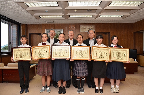 令和元年度第42回全日本少年少女武道錬成大会なぎなたの部(8月4日に東京都日本武道館で開催)で優秀賞などに輝いた市内小・中学生の皆さん6人が9月12日、主濱市長を表敬訪問しました。