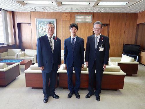 1カ月間の農村研修を終えた農林水産省職員の竹下慧さんが11月8日、主濱市長へ研修の成果を報告に訪れました。農村研修は、農林水産省入省後2年目の若手職員を1カ月間全国各地に派遣し、農林水産業の実態や農林漁業者の実情を経験させる農林水産省独自の研修プログラム。地域の実態に即した人材を幅広く養成することが目的です。
