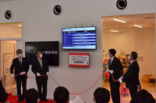 市は、岩手県交通株式会社で導入しているバスロケーションシステムを表示するためのデジタルサイネージを、滝沢市役所とビッグルーフ滝沢へ設置しました。この運用開始にあたり、3月25日に、ビッグルーフ滝沢で運用開始式が開催されました。