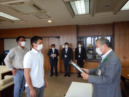 市農業経営改善計画認定書交付式が5月23日、市長室で開催されました。今回認定されたのは、市の地域おこし協力隊として活動しワイン用ブドウの生産を志す、(株)八瀬葡萄酒の山田直輝(やまだ なおき)さんと、国内シェア1%である羊肉を滝沢市で育てたいという志を持つ(株)モンゴル未来のラオグジャブ ムンフバットさん、そして滝沢スイカを中心として多品目の野菜を生産する三上恒史(みかみ こうし)さんの3人です。