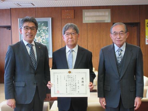 (写真)左端=市長、中央=牛抱さん、右端=千葉副会長