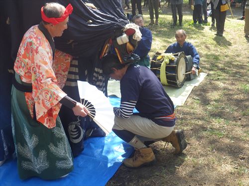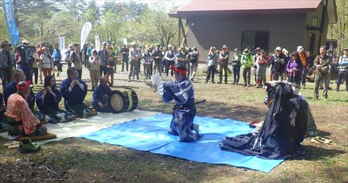 鞍掛山山開き式が4月29日、鞍掛山の麓のたきざわ自然情報センター前で開催されました。式では登山者や関係者などおよそ300人が集まる中、篠木神楽保存会による演舞も披露されました。