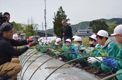 当日は滝沢小学校5年生の児童約120人が、駿河さんから植え方を教わりながら、30cmほどの丈の苗を丁寧に植えました。