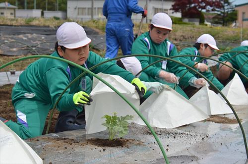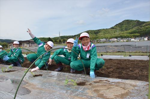 馬ふん堆肥を活用して育てる滝沢スイカ「ちゃぐちゃぐスイカ」の定植会が5月1日、外山の駿河俊也(するがとしや)さんの農地で実施されました。