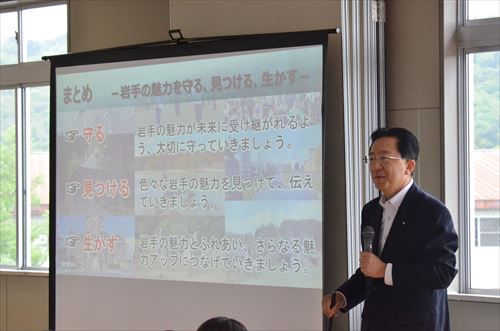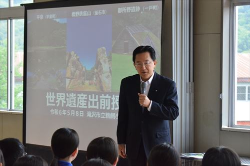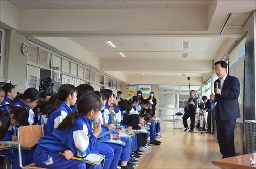 達増拓也(たっそたくや)岩手県知事による出前授業が5月8日、鵜飼小学校で実施されました。
