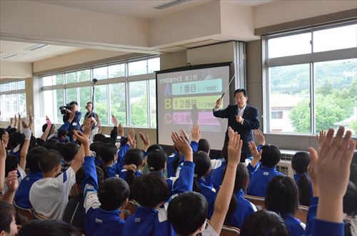 これは、修学旅行で岩手県内の世界遺産を訪れる児童たちの事前学習として、総合的な学習の時間の中で実施されたものです。授業では同校6年生の児童99人が、岩手県にある3つの世界遺産(中尊寺、橋野鉄鉱山、御所野遺跡)とそれらに大きく関わった人物や、地域で世界遺産を保全していくための取り組みなどについて、クイズを交えながら楽しく学びました。
