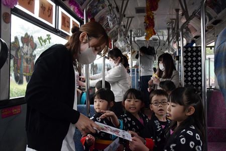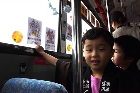 馬コ衣装に身を包んだ園児たちは、自らカラフルに色を塗った馬コの塗り絵や鈴のイラストなどの装飾品を楽しそうにバス内に飾り付けていました。