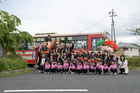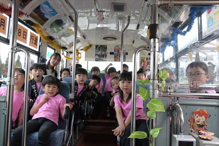 また、園児たちは作業が終わると「チャグバス、出発進行!」の掛け声とともに、装飾したバスへの乗車体験を行いました。