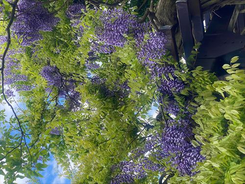 角掛神社の五龍のフジが紫色の花を咲かせました。