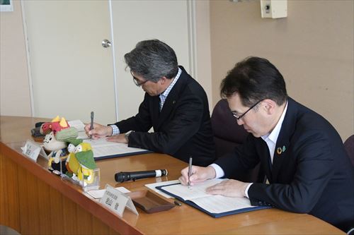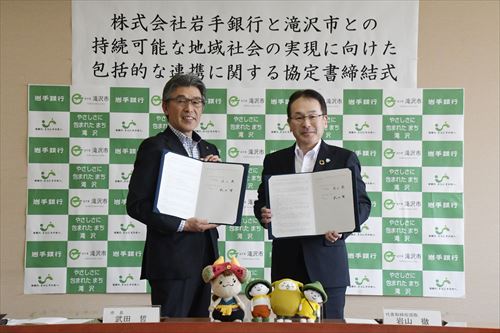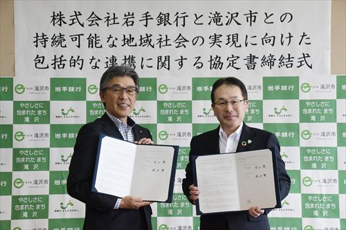株式会社岩手銀行(岩山徹代表取締役頭取)と本市による持続可能な地域社会の実現に向けた包括的な連携に関する協定の締結式が5月21日、市役所で執り行われました。