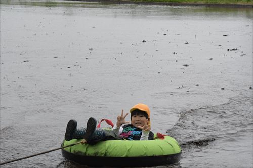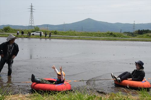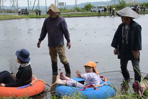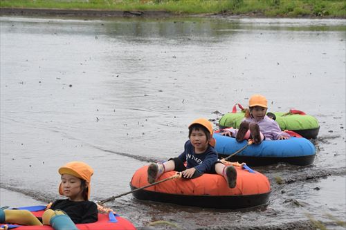 当日は、一本木保育園の園児約10人が馬の引くタイヤチューブに乗り、ゆっくりと田んぼの中を巡る「泥チューブ」を体験しました。
