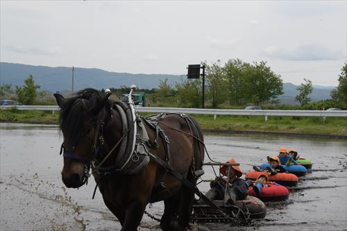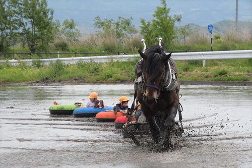 チャグチャグ馬コ農耕馬によるアクティビティ体験が5月30日、一本木地区の水田で行われました。