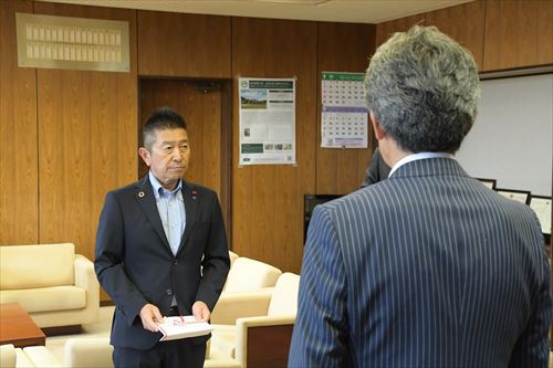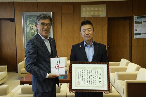 当日は同社の武田克彦(たけだかつひこ)代表取締役社長と因幡一啓(いなばかずひろ)事業部長が市長を訪問。武田社長から市長に10万円の目録が手渡されました。