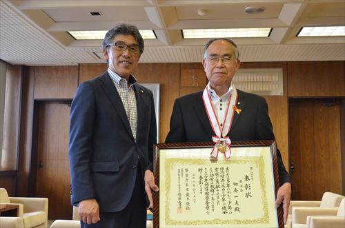 少年補導栄誉金章を受章した切金一夫さんが7月5日、市長を表敬訪問しました。