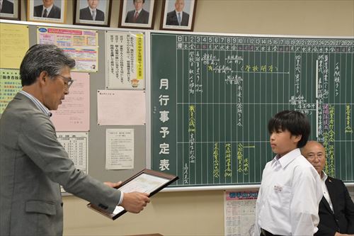 これは、同校1年生の松塚亜蓮(まつづかあれん)さんが、初期消火を行い、火災を未然に防いだことに対し感謝状を贈呈したものです。