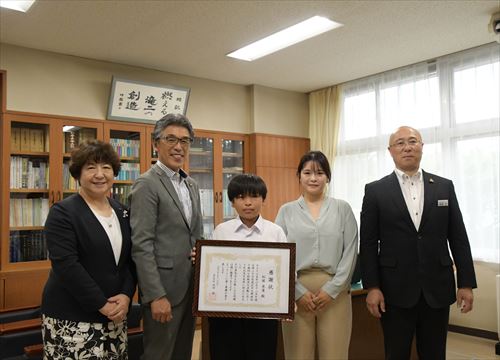 市長は「消火器は、一生のうちに使うことがない人も多い。状況に応じて適切な行動がとれる松塚さんは素晴らしい。周りの人のお手本になる行動であるので、友達などにもぜひ伝えていってほしい」と激励しました。