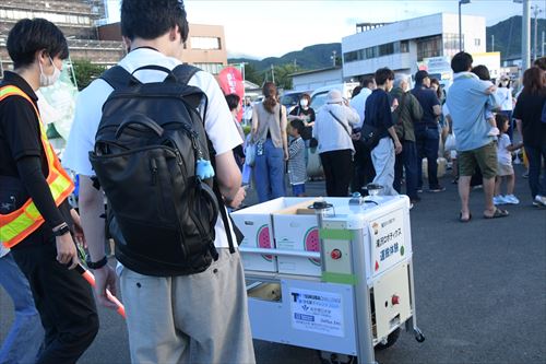会場では、市IPUイノベーションセンター入居企業である滝沢ロボティクス合同会社が、同イベントでは初の試みとなる、ロボットを使用したスイカ運搬体験を実施。ロボットが障害物をよけながら購入者の車までスイカを運搬し、人々を驚かせていました。