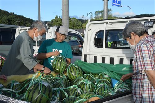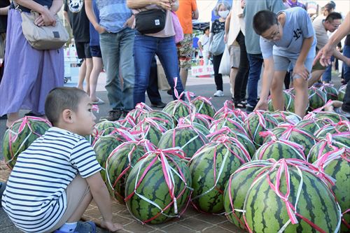 滝沢スイカまつり・たきざわ日曜朝市が8月11日、ビッグルーフ滝沢で同時開催されました。訪れた人は、生産者が丹精込めて育てた自慢の滝沢スイカを前に「どれが一番おいしいかなあ」と目を輝かせていました。