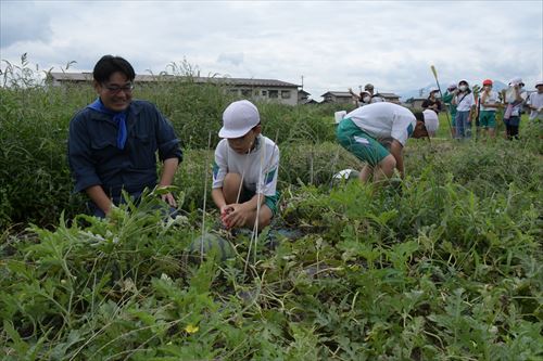 滝沢小学校の5年3組と4組の児童61名が8月21日、駿河俊也(するがとしや)さんの畑で、5月に定植を行ったちゃぐちゃぐスイカの収穫体験を行いました。