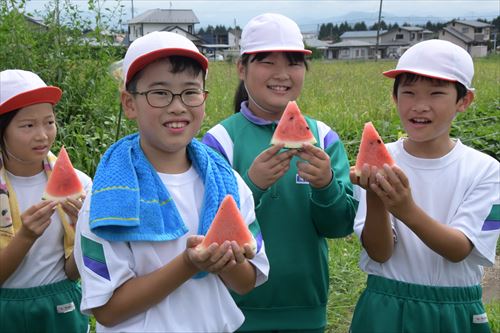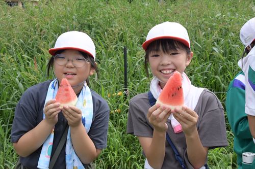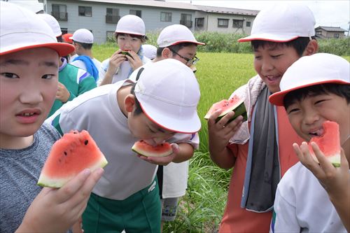 代表で収穫体験をした5年3組の本宮斡人(もとみやあつと)さんは「スイカのつるが力を入れなくても切れたのが意外だった」と驚いていました。同じく収穫体験をした5年4組の松舘優月(まつだてうる)さんは「いつも食べているスイカよりみずみずしくて味が濃い」と笑顔で食べていました。