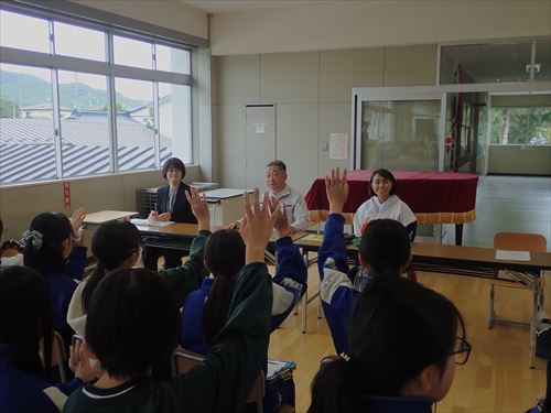 鵜飼小学校(6学年)の児童は、郷土について深く学ぶため「馬コ・さんさ・蒼前太鼓・まちづくり・食文化(スイカと米)」など、テーマごとにグループをつくり学習しています。講師から「滝沢市さんさ踊り」の歴史と踊りの特徴について説明を聞いた後、実際の太鼓の音と合わせて滝沢市さんさ踊りのしなやかな演舞を見学しました。質疑応答の場面では児童から積極的な質問がいくつも飛び出し、講師が一つ一つ丁寧に回答する姿が印象的でした。