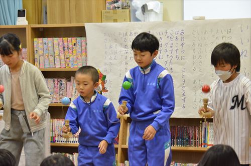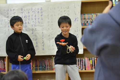 児童から配られた飲み物で乾杯をした後は、普段の学童保育で練習したこま回しやけん玉などを披露。見事に技が決まると、会場は拍手で包まれました。