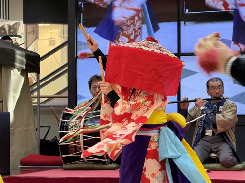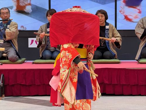 今回披露した演舞は田植踊りの中でも主に「稲刈り」を表現したもので、多くの人が五月女のしなやかな踊りに目を奪われている様子でした。