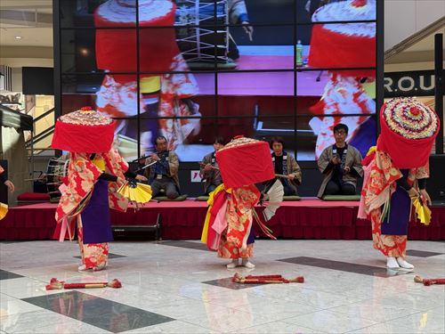 ステージ前には100人にも及ぶ観客が集まり、大沢田植踊り保存会の4人の五月女(しょうとめ)が艶やかな朱色の衣装を身にまとい華麗な演舞を披露しました。