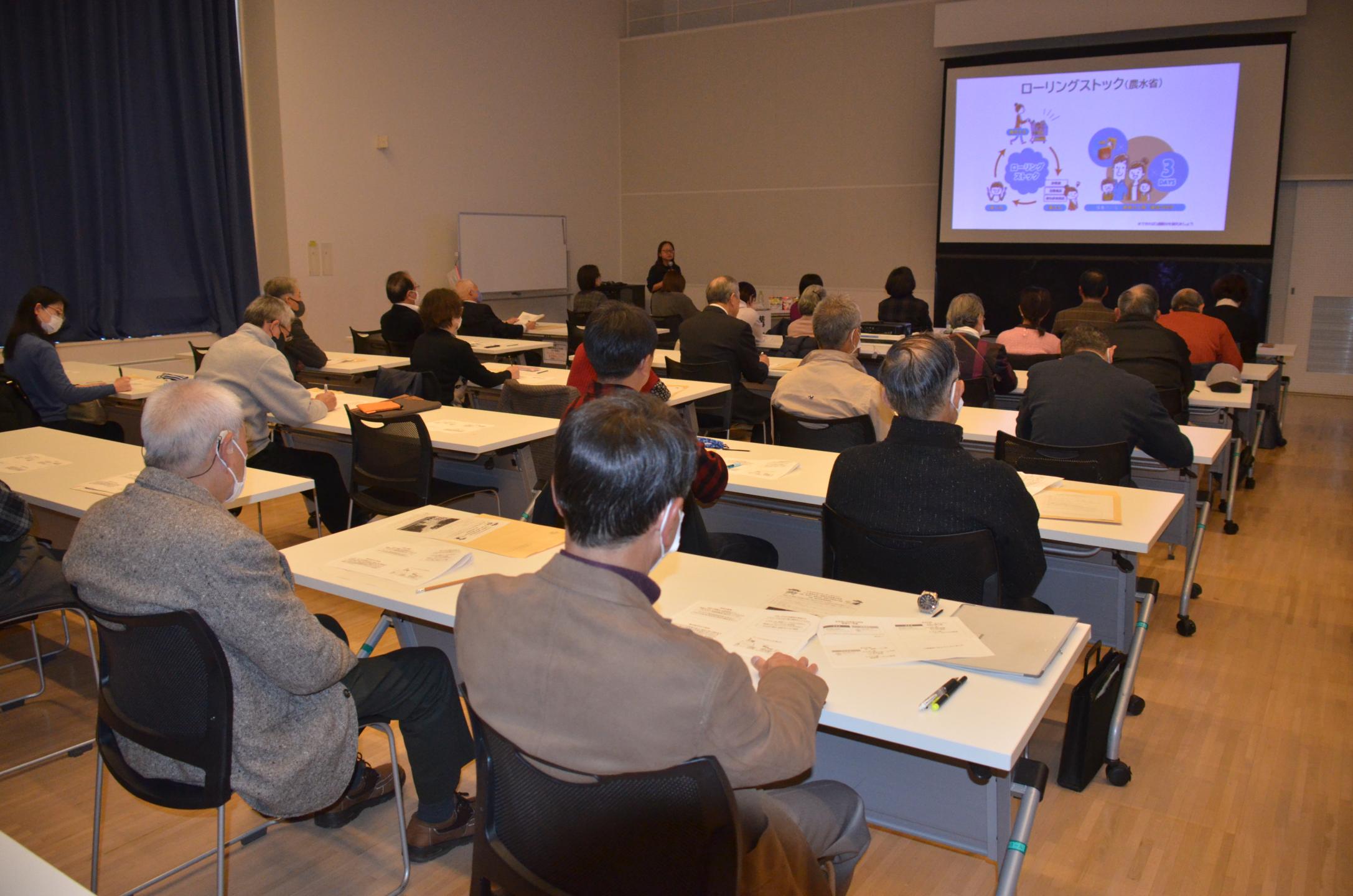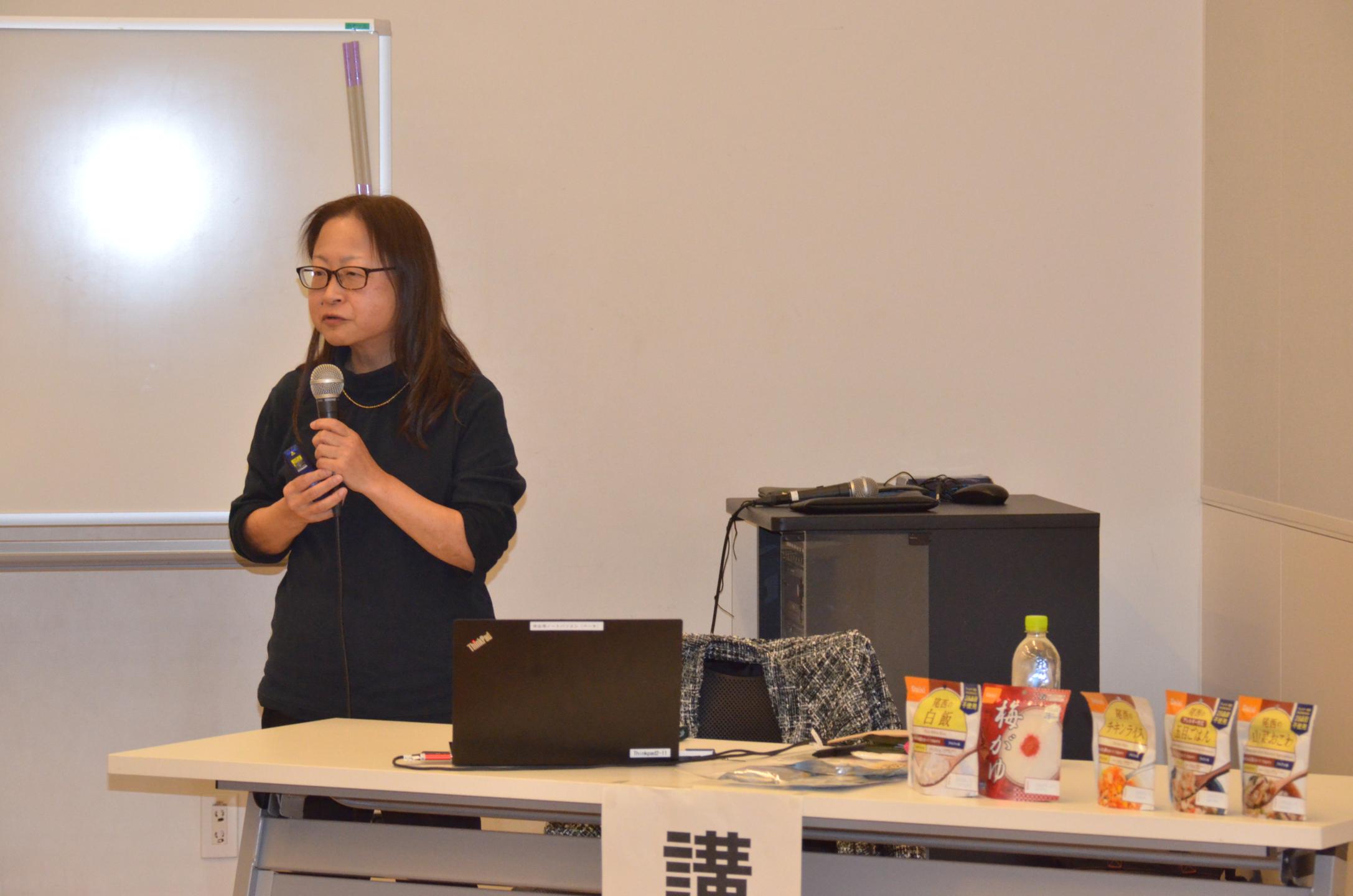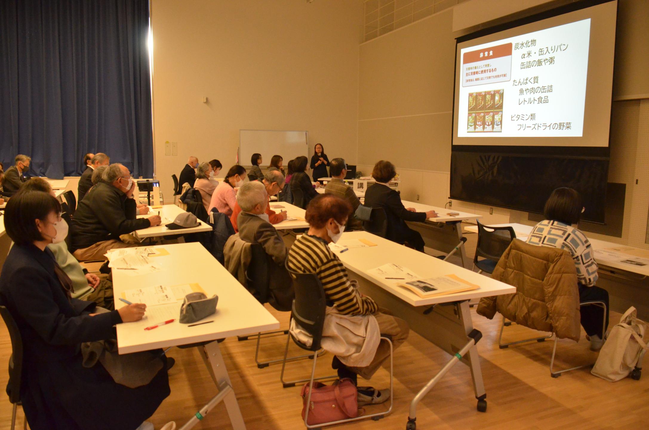 当日は、同大学栄養科学部栄養科学科の村元美代(むらもとみよ)教授による「災害時の栄養~非常食の考え方とローリングストックについて」と題した講演を通じ、災害時に備えた地域コミュニティの在り方や非常食の循環備蓄(ローリングストック)などについて40人超が理解を深めました。