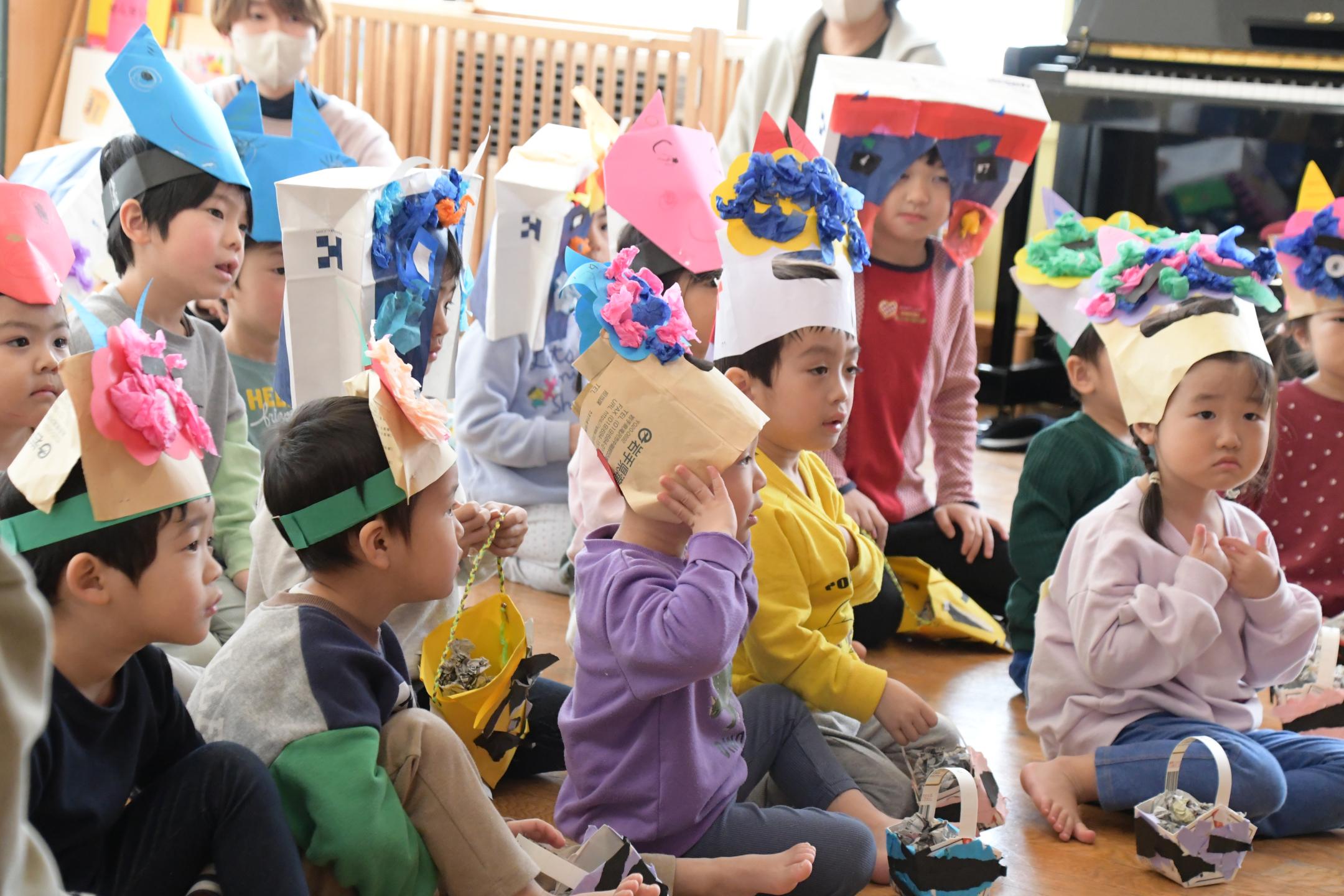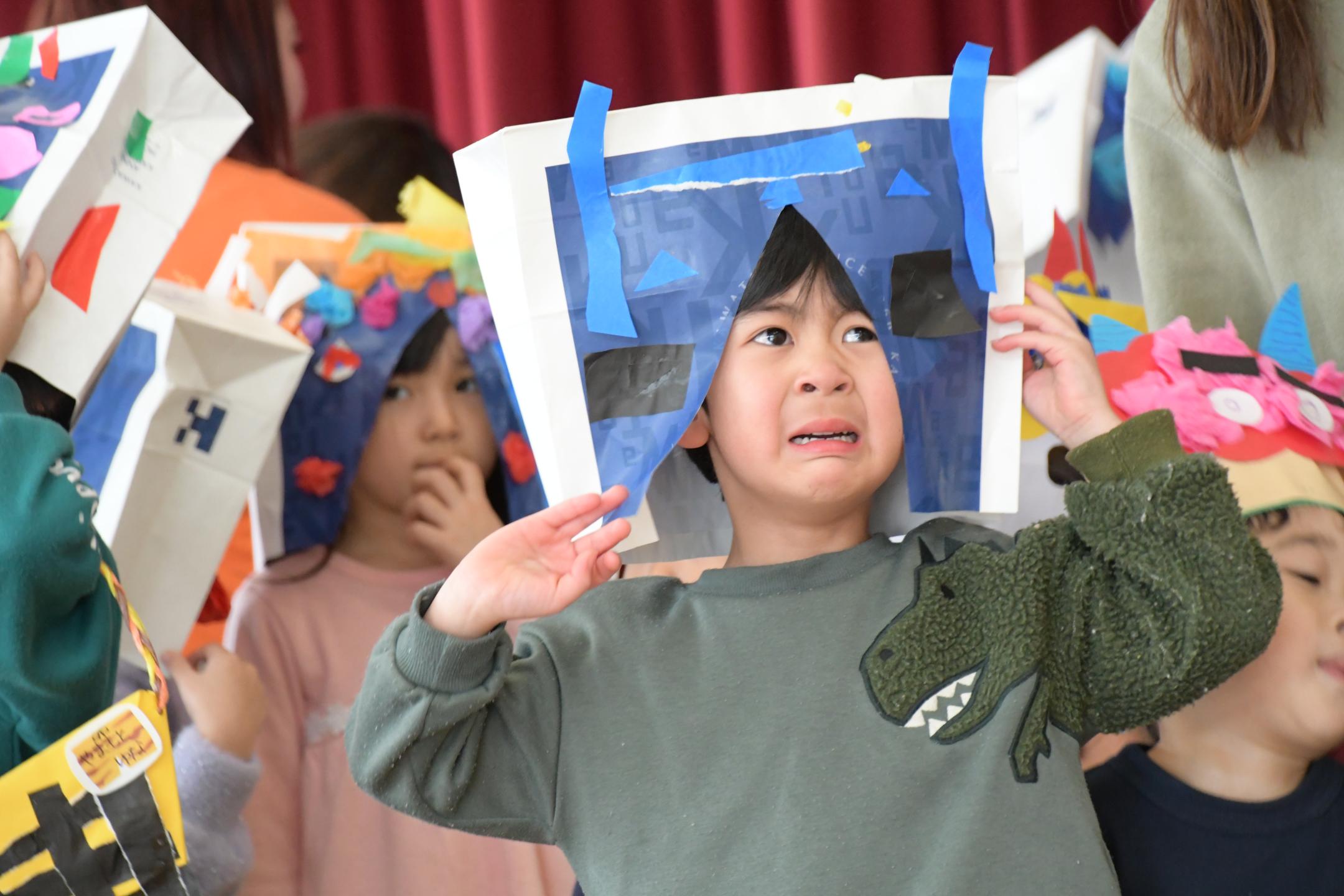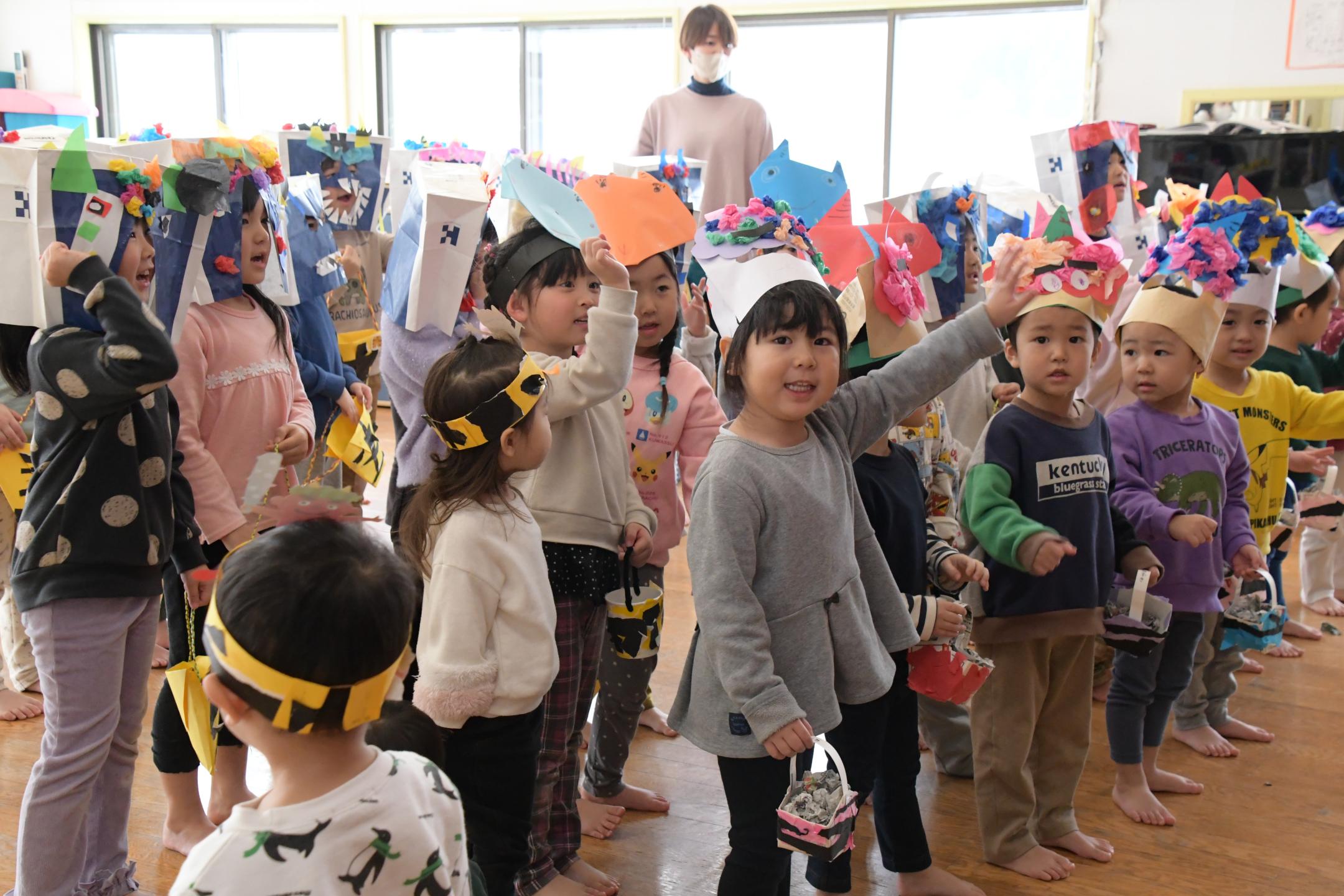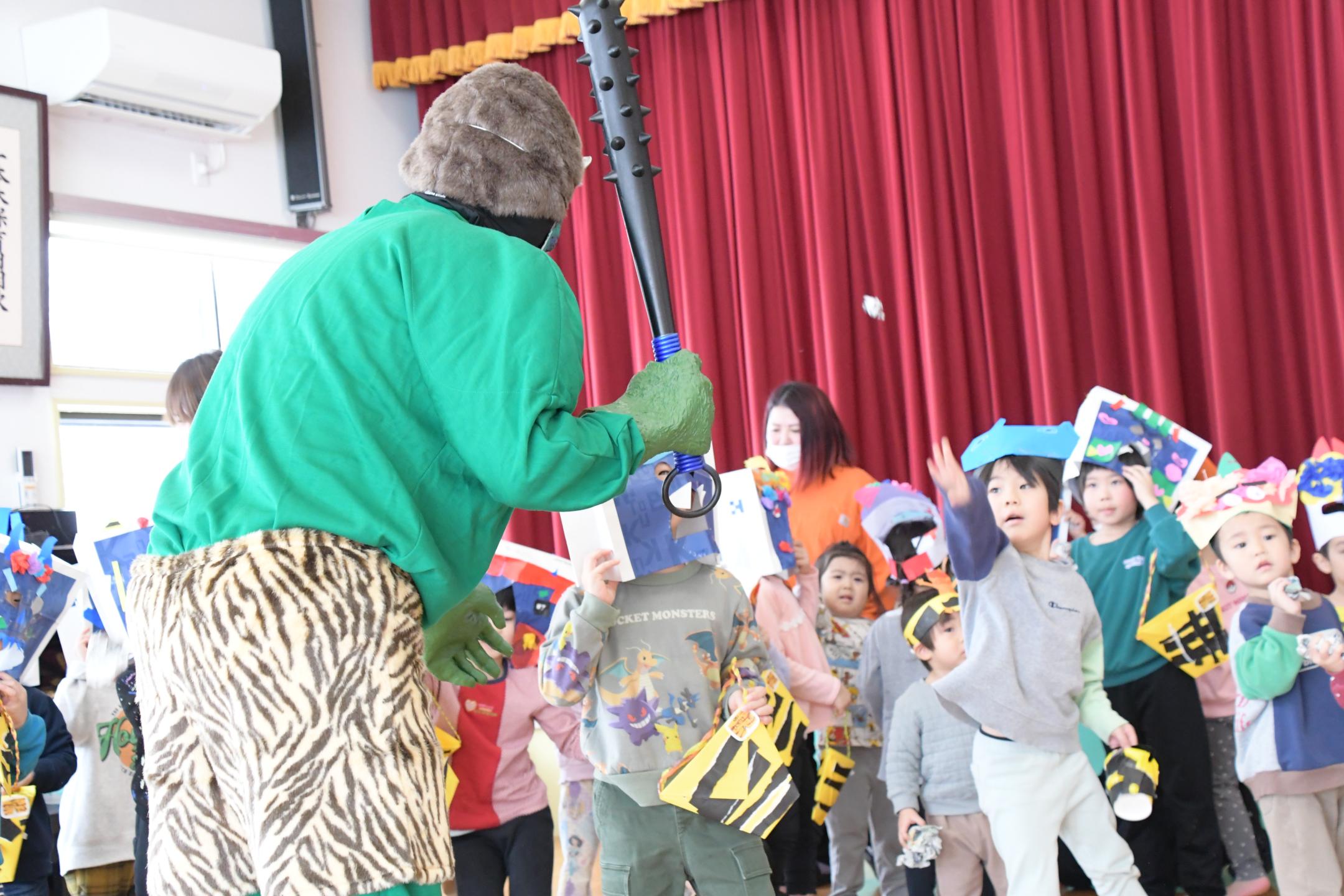 子どもたちは、あらかじめ用意していた「なきむしおに」や「おこりんぼおに」などの「心の中の鬼」のお面をつけながら「鬼は外、福は内」と掛け声を練習。そこに太鼓の音と共に鬼が登場すると、子どもたちは一目散に逃げ出しましたが、勇気を振り絞って豆に見立てた丸めた新聞紙をまき、無事に鬼を退治しました。鬼からは「おうちの人や先生のお話をしっかり聞くんだぞ」と声が掛けられ、子どもたちは「はい」と元気に返事をしました。