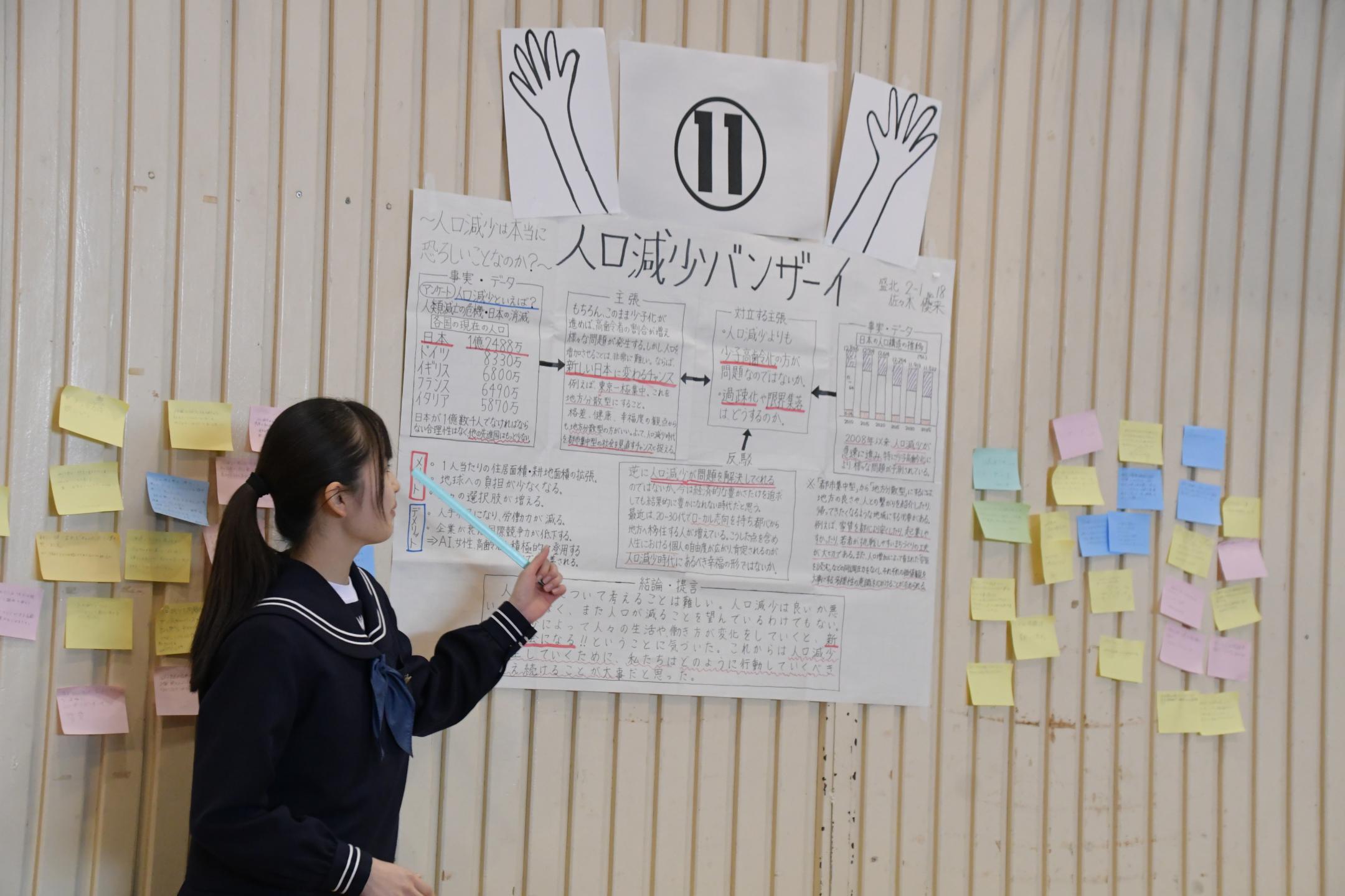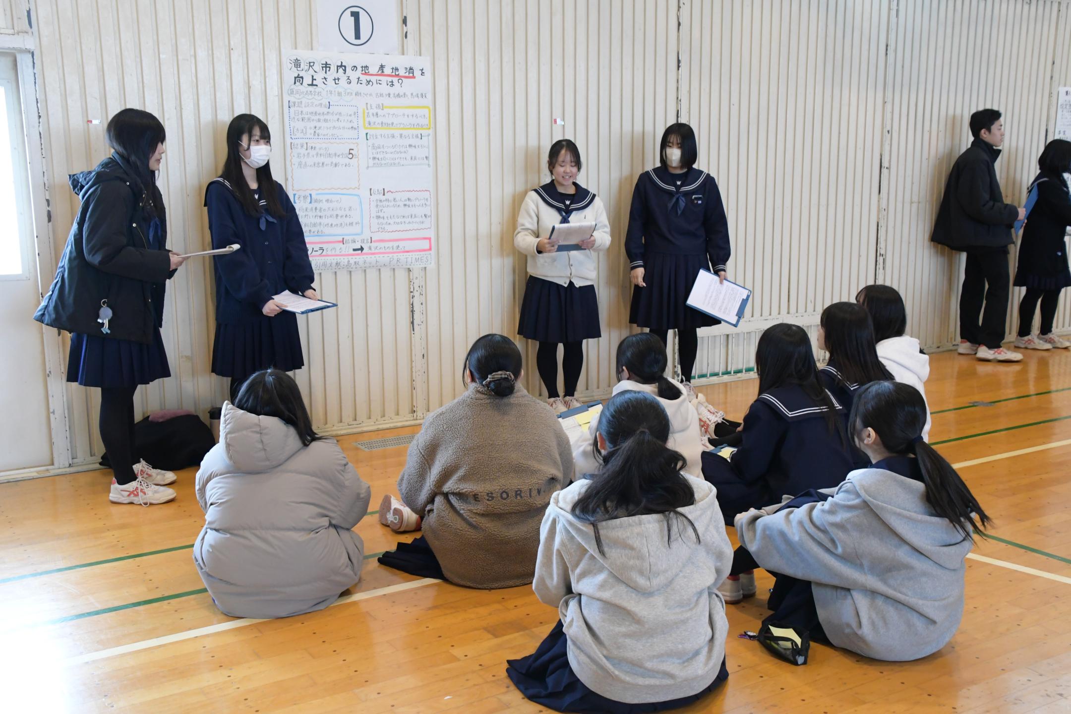 「滝沢市内の地産地消を向上させるためには?」や「人口減少バンザーイ」など、生徒が自ら設定したユニークなテーマに対し、具体的な課題や解決策を発表しました。また、傍聴する生徒は「差し入れ」と呼ばれるアドバイスを書いた付箋紙を発表者に渡すことで、発表する側と、発表を聞く側双方の学びを深めていました。