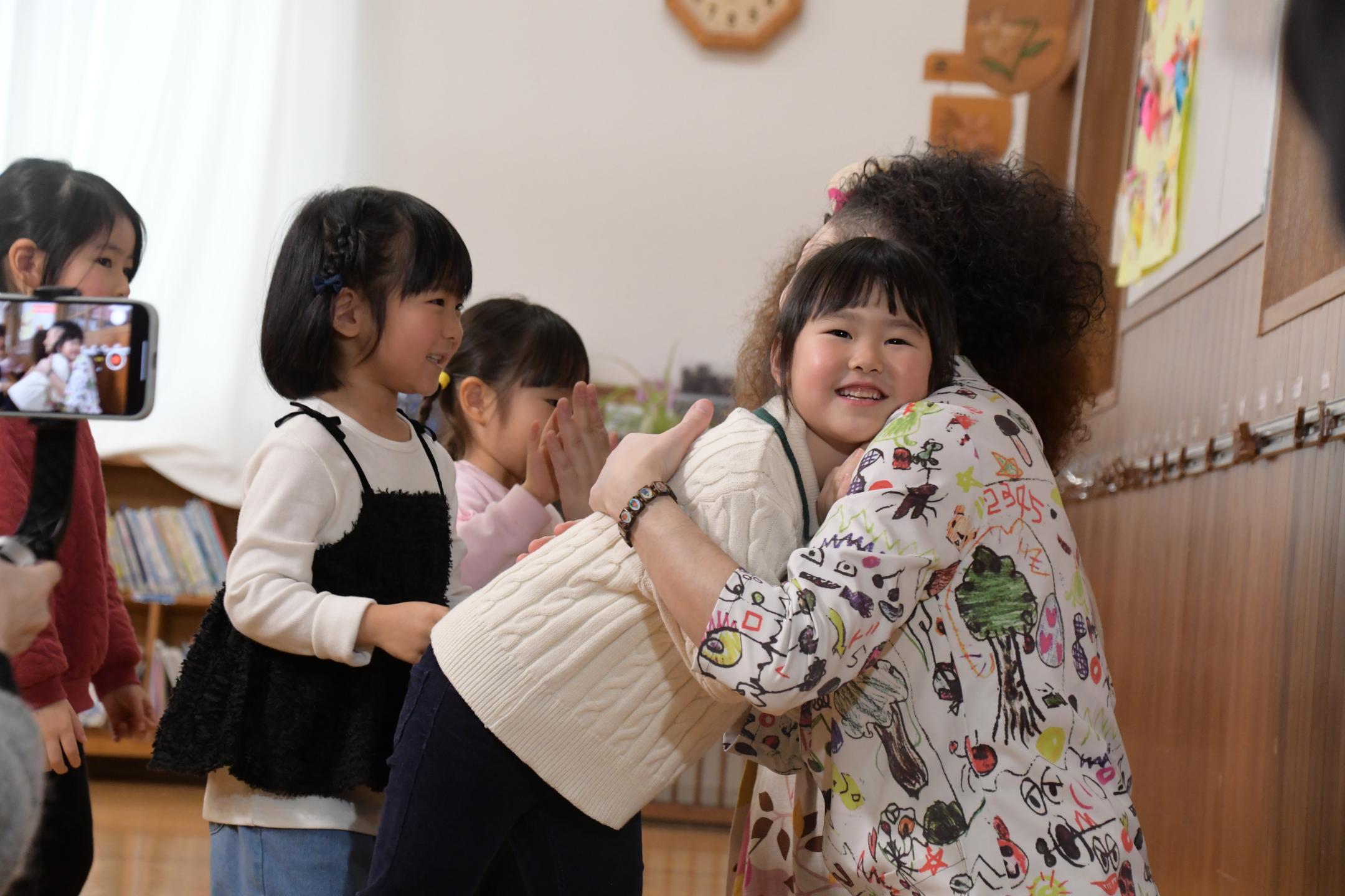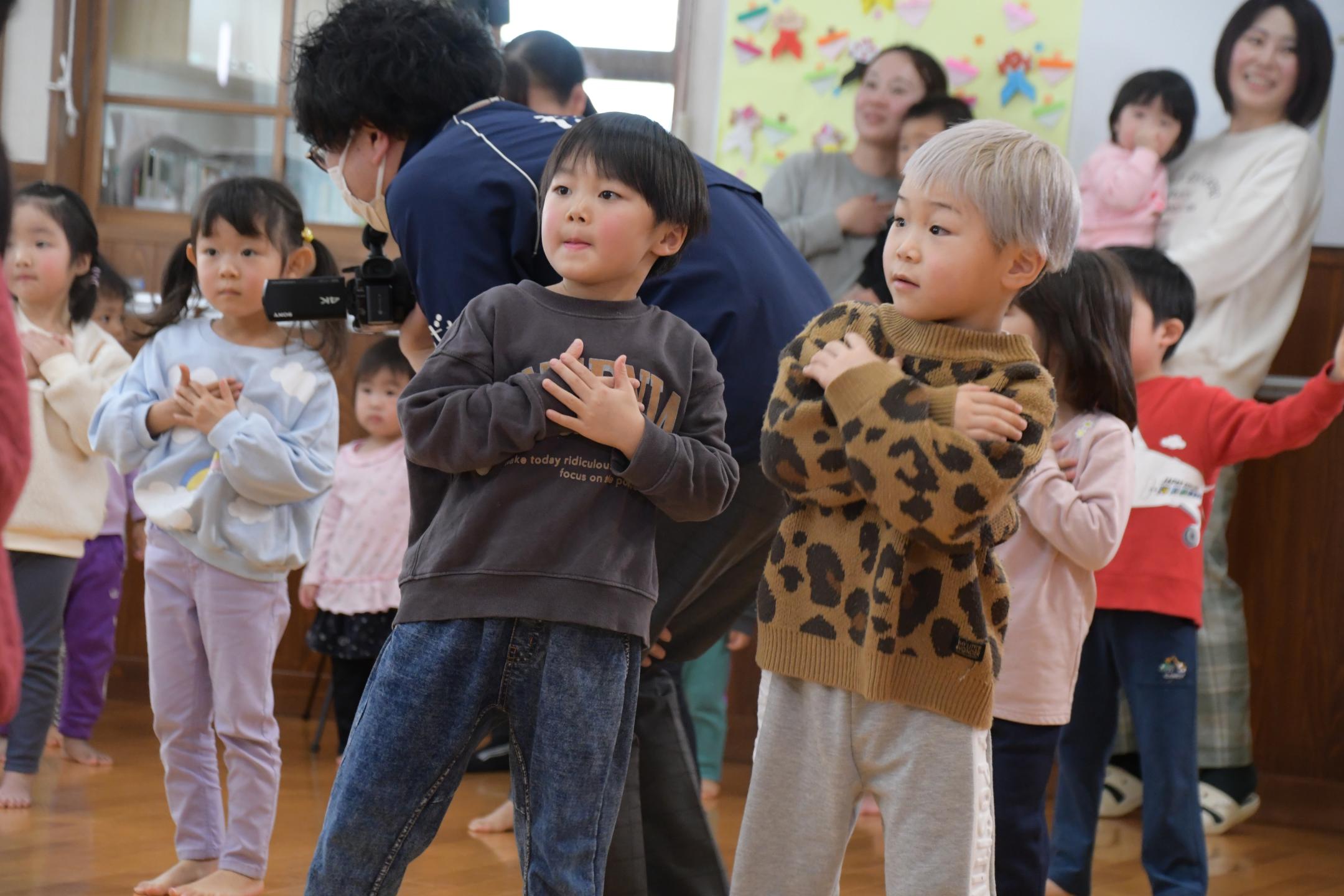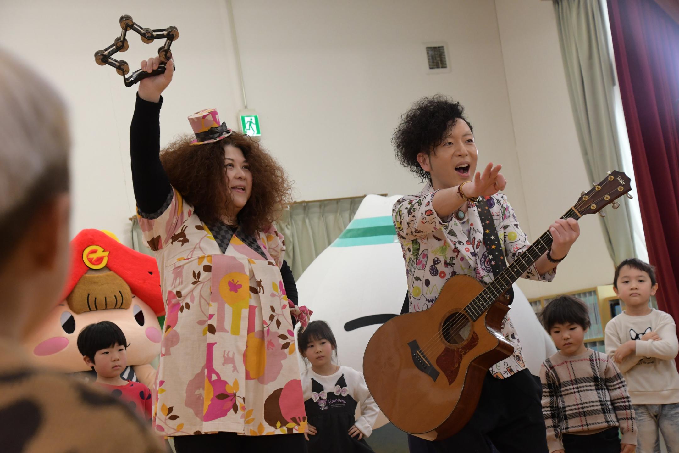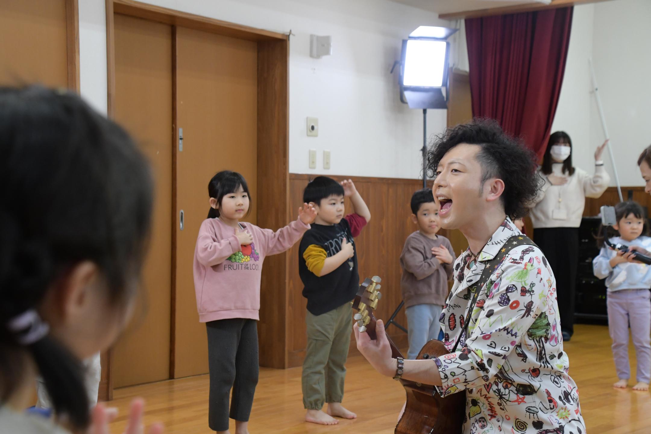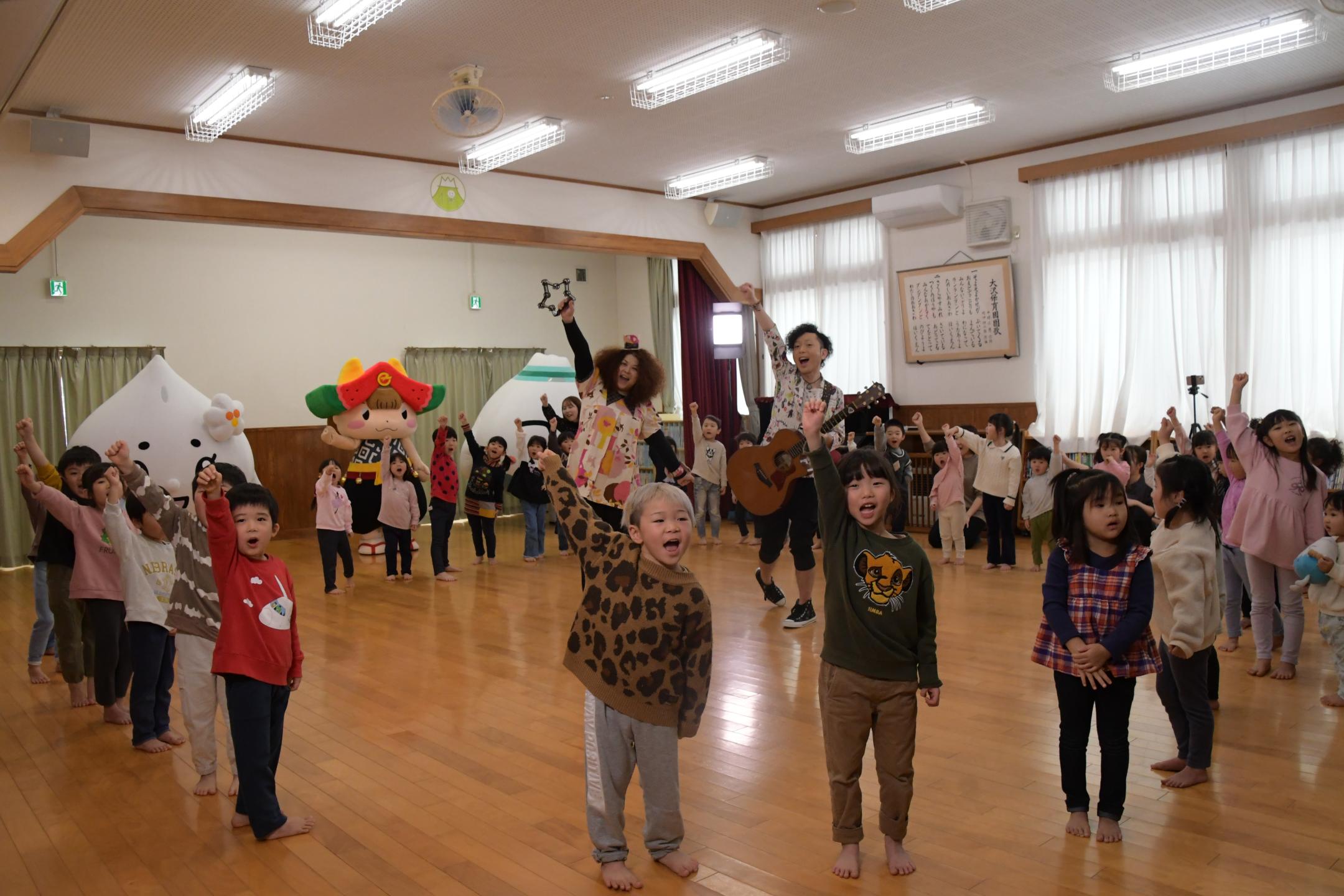 当日は県在住音楽ユニットunderpath!(アンダーパス)の2人が「いわてみんなのうた」でおなじみの「たらりら」滝沢バージョンを歌い、園児たちも練習していた歌と踊りを元気に披露しました。