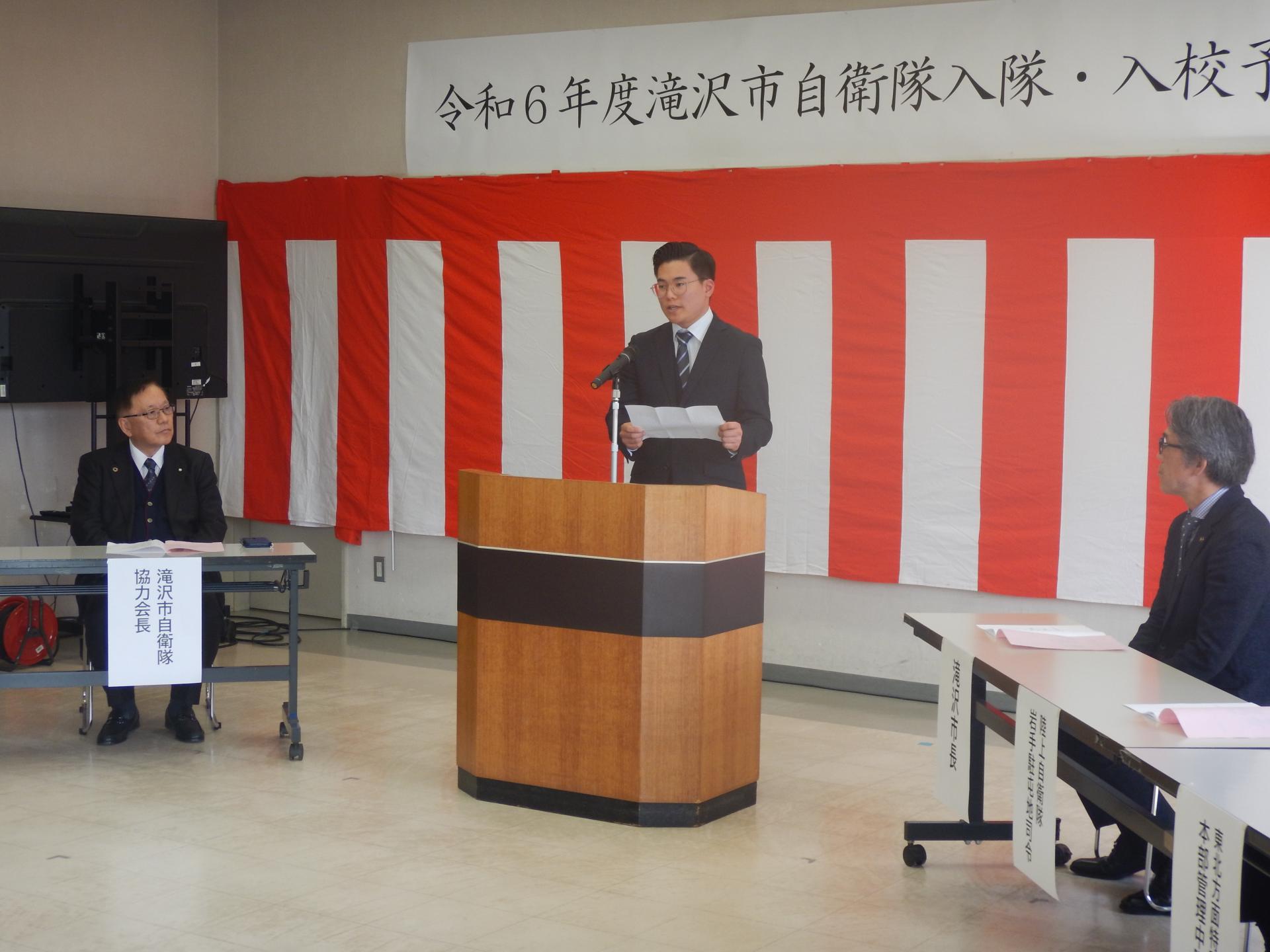 入隊・入校予定者代表の小林悠河(こばやしゆうが)さんは「近年、自衛隊が果たさなければならない役割は重要になってきている。未曽有の大震災が予想される日本において、国民に寄り添い、国民の利益を守る任務を任されるということは、大変光栄であると感じる。これから始まる教育や訓練を思うと不安がよぎるが、滝沢で学んだことを誇りに持ち、それぞれの目標に向かって、邁進していきたい」と決意を述べました。