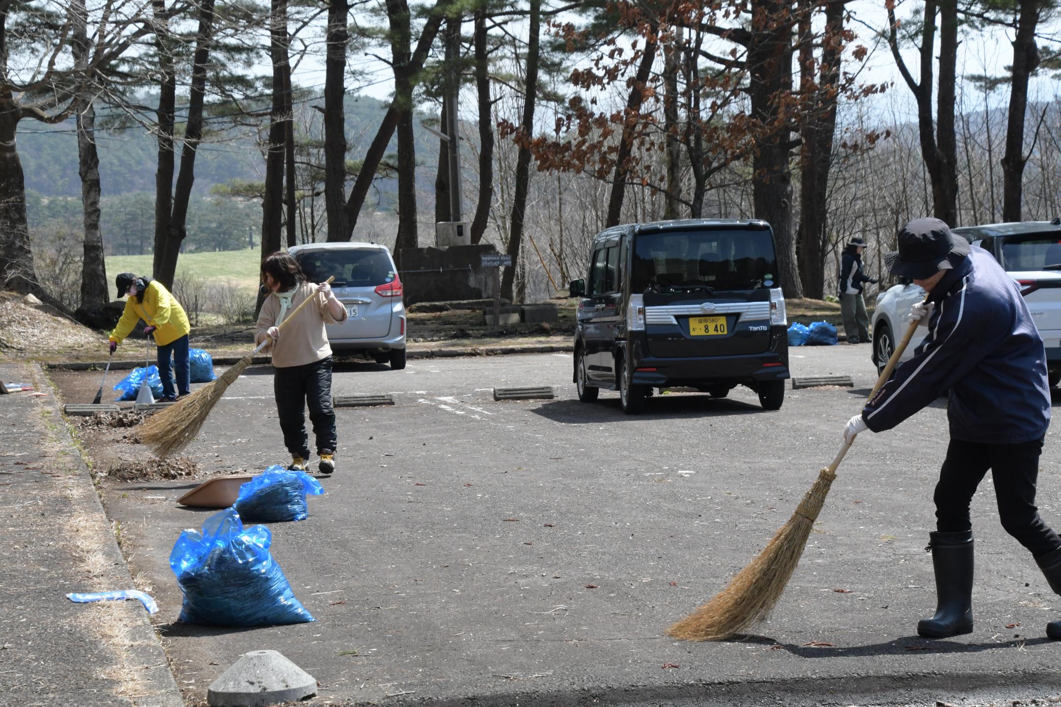 この日は同クラブ会員など18人が清掃活動に参加。4月29日に予定されている鞍掛山の山開きを前に、駐車場内や側溝にたまった落ち葉などを清掃しました。清掃活動が終了すると、落ち葉に覆われていた道路や駐車場、側溝が見違えるほどきれいになりました。