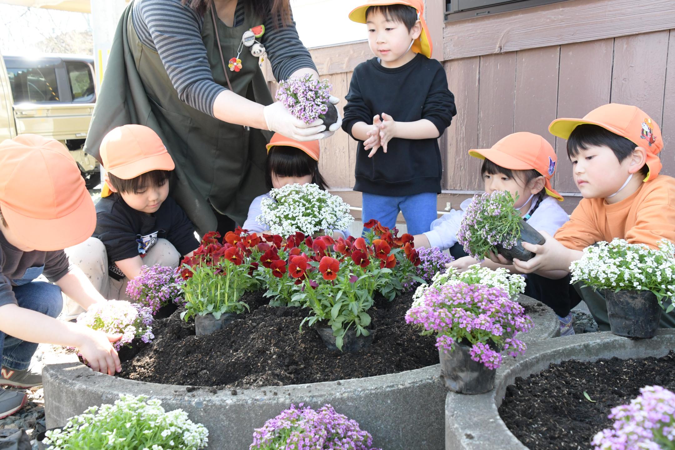 当日は約30人の園児たちが駅前の花壇を囲み、手を土まみれにしながらも楽しく花を植えました。きれいに仕上がった花壇を見た園児たちは「オレンジ色のお花がきれい」や「僕頑張った」などうれしそうに話しました。