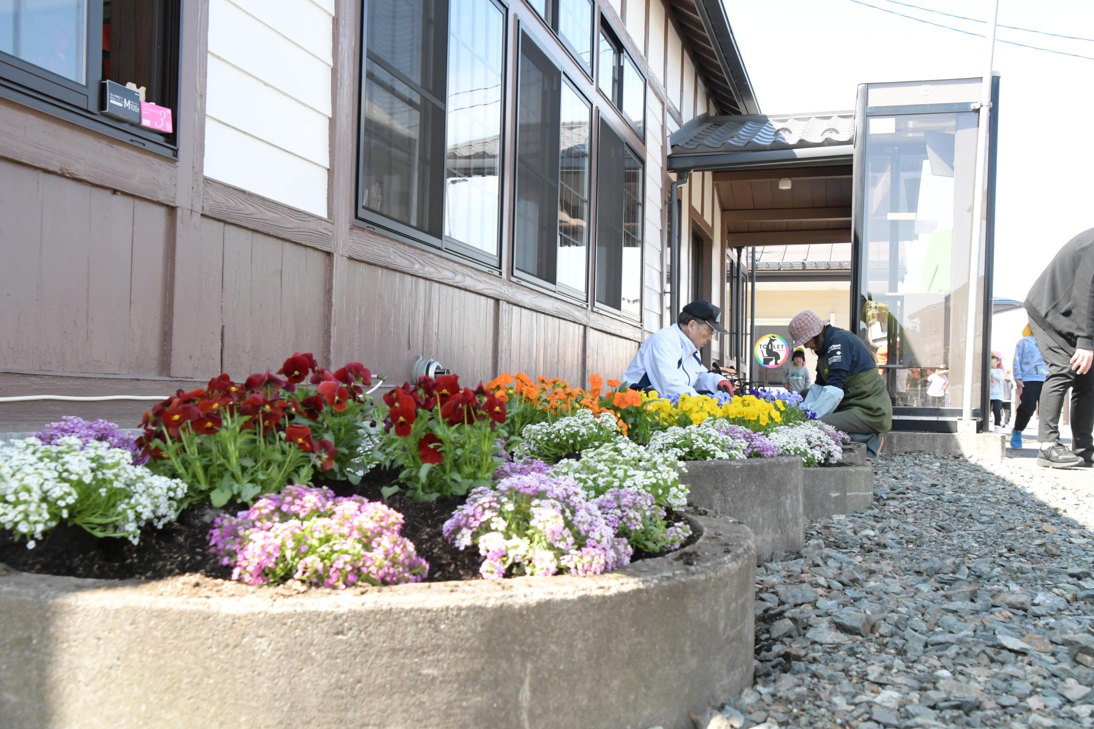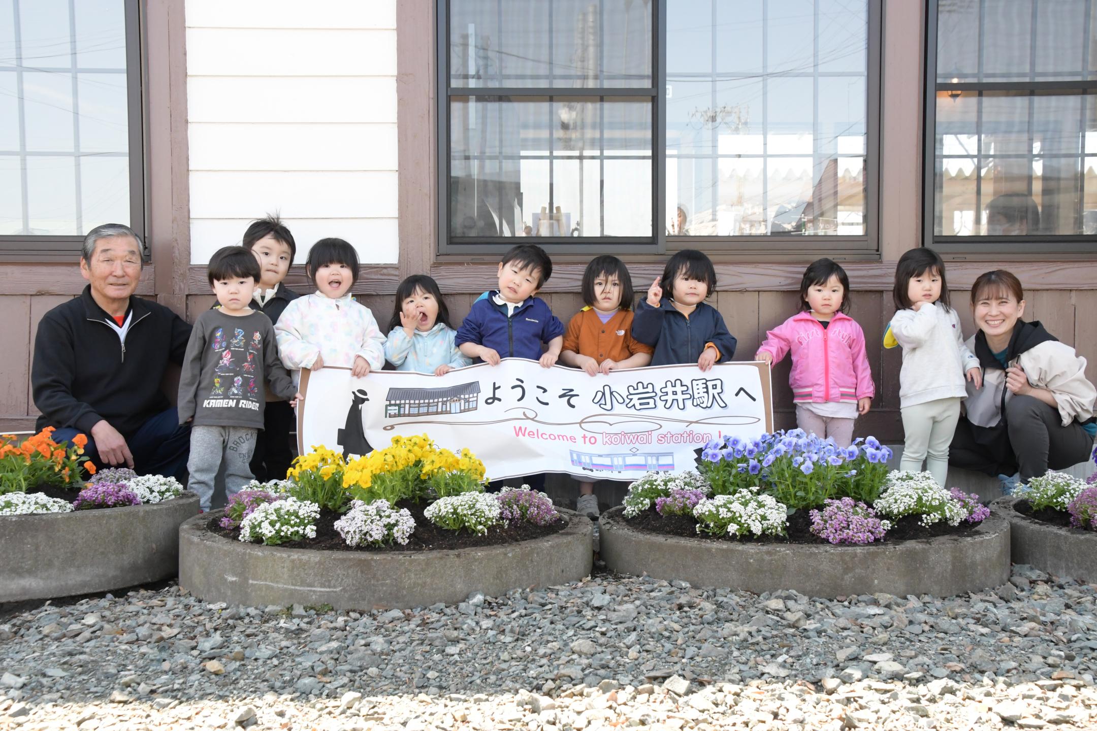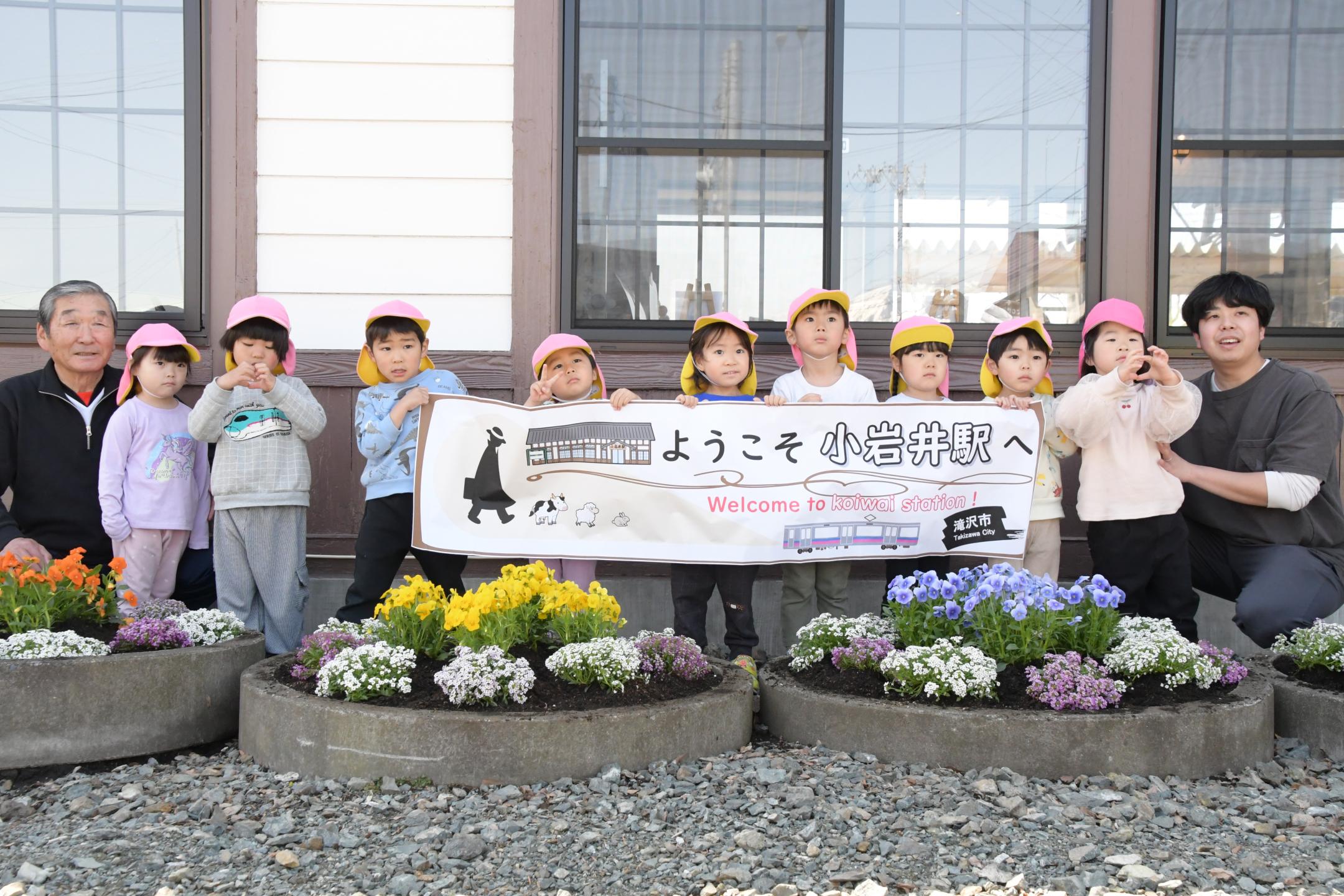 この催しを企画した同自治会の山本美喜子(やまもとみきこ)さんは「園児の皆さんのおかげで、駅が華やかになりうれしい。市民の皆さんにもぜひ小岩井駅を訪れ、新しい駅舎やきれいな花を見てほしい」と話しました。