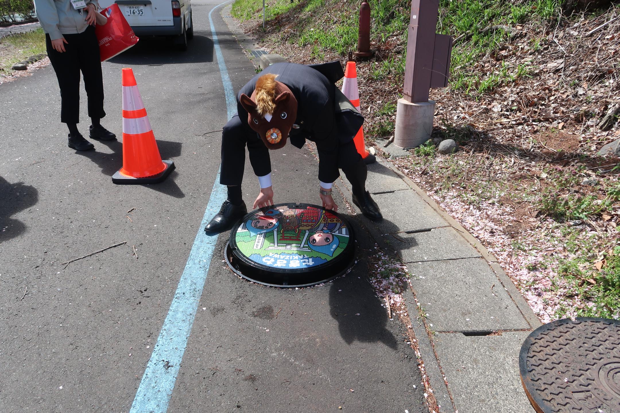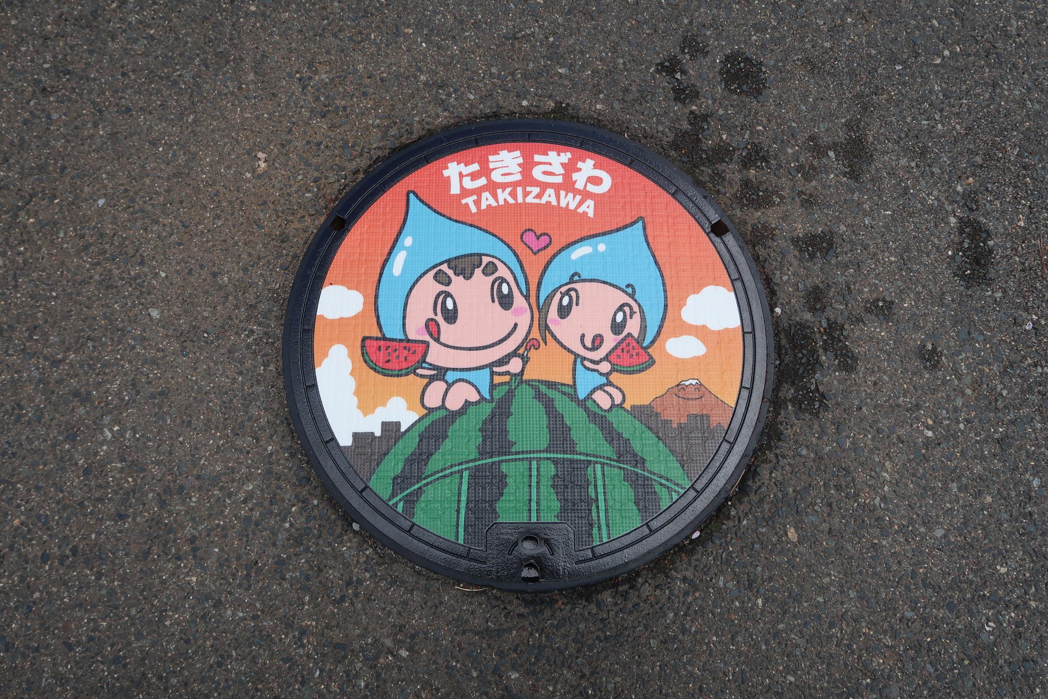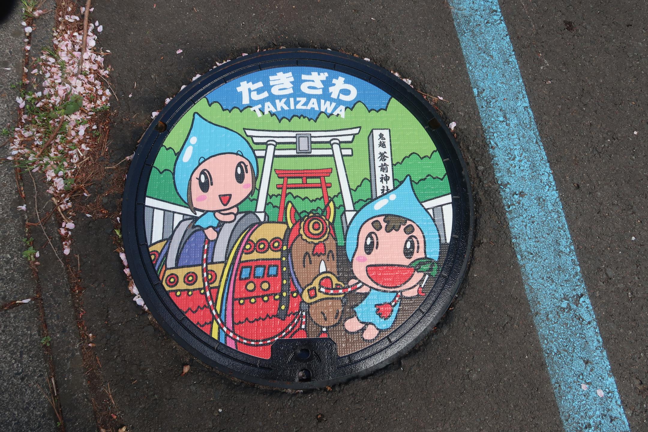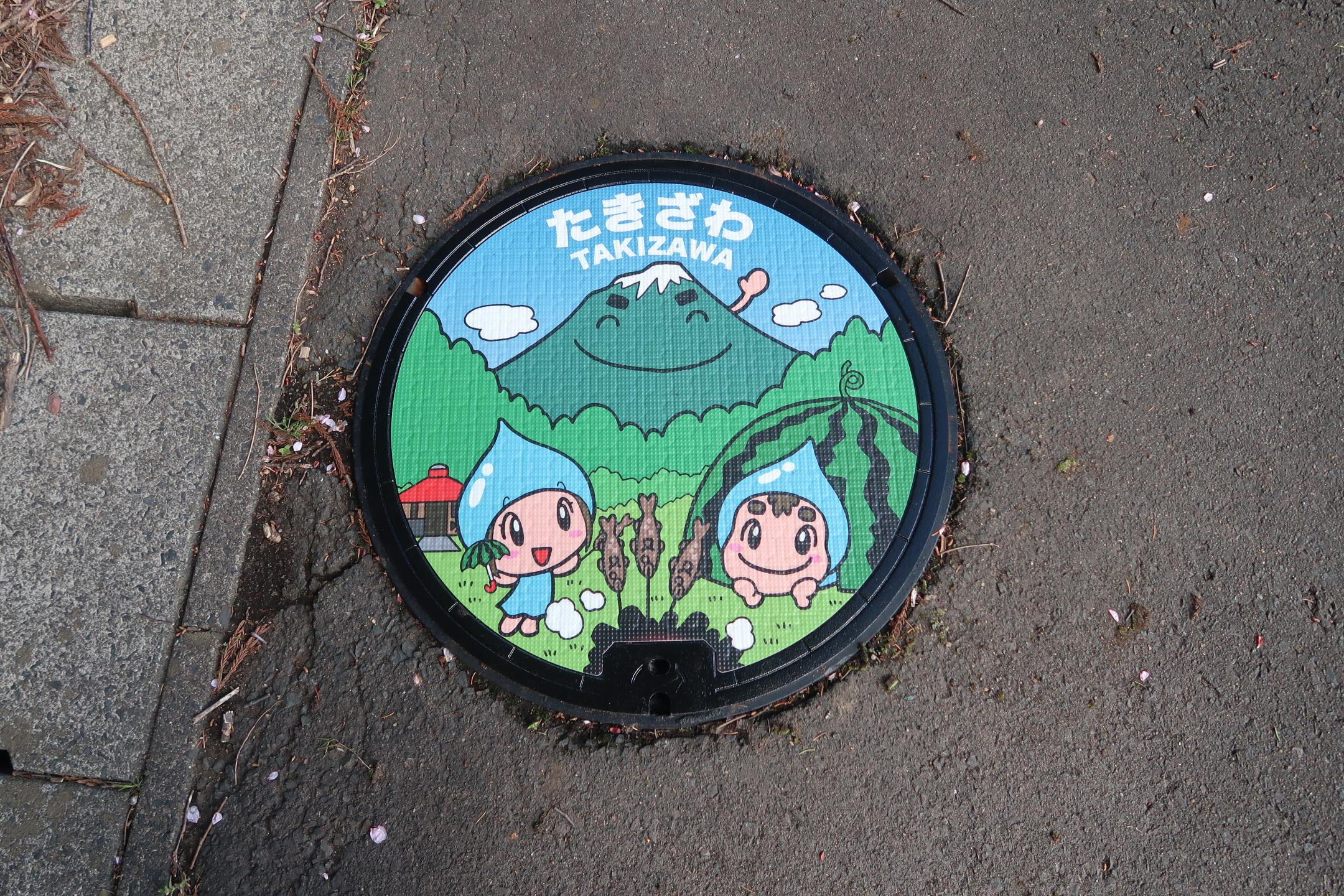 今回設置したマンホール蓋は4枚。市内在住のデザイナー「たぐさん」がデザインしたもので、市上下水道事業のキャラクター「タッキー&サワー」が岩手山、盛岡ガス㈱滝沢工場のすいかのガスタンク、鬼越蒼前神社、小岩井駅など市の各地を訪れています。