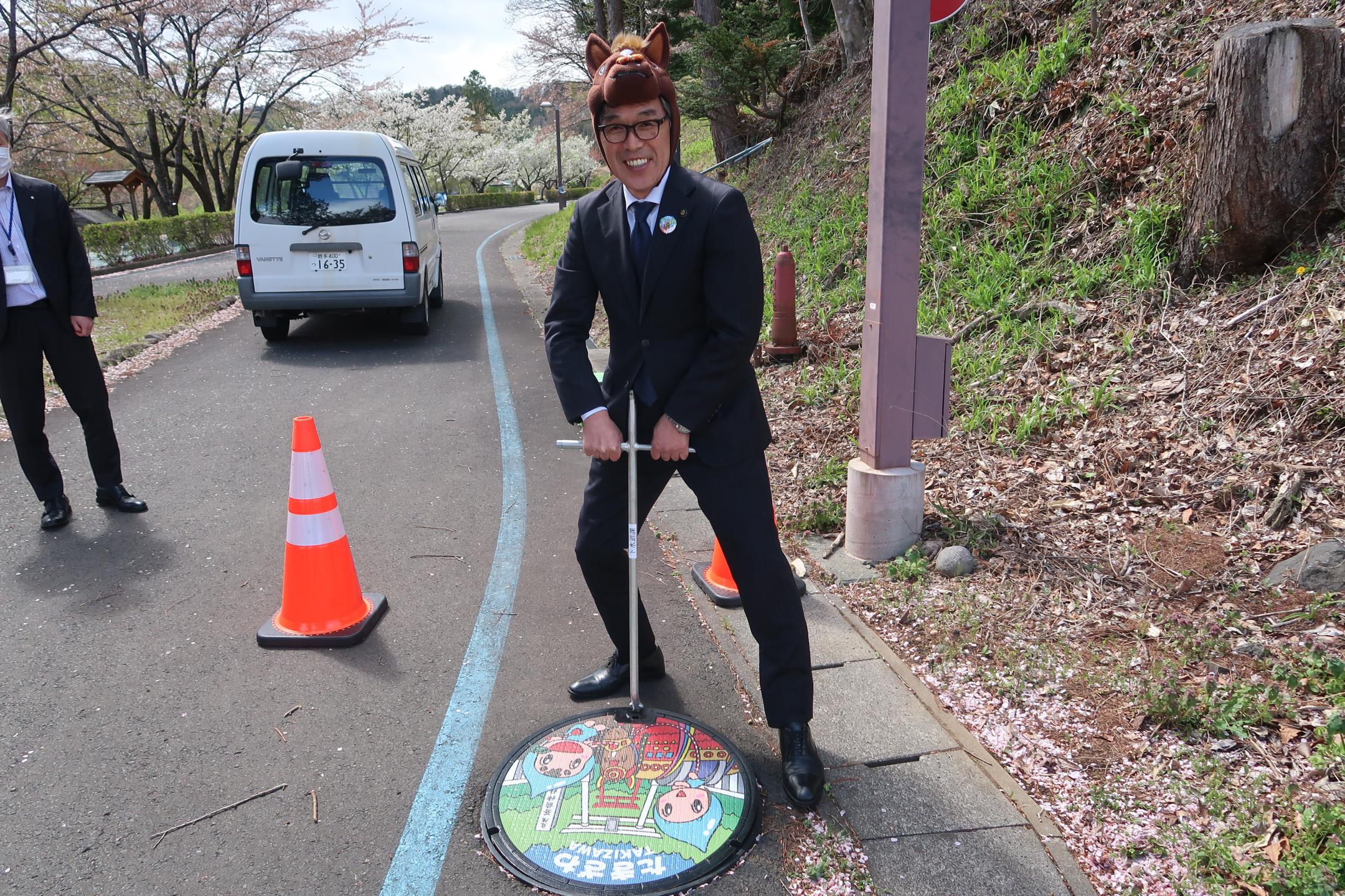 マンホール蓋を設置した市長は「市民の皆さんには、ウオーキングとともに、設置したマンホール蓋のデザインや季節の景色も楽しんでもらえるとうれしい」と話しました。