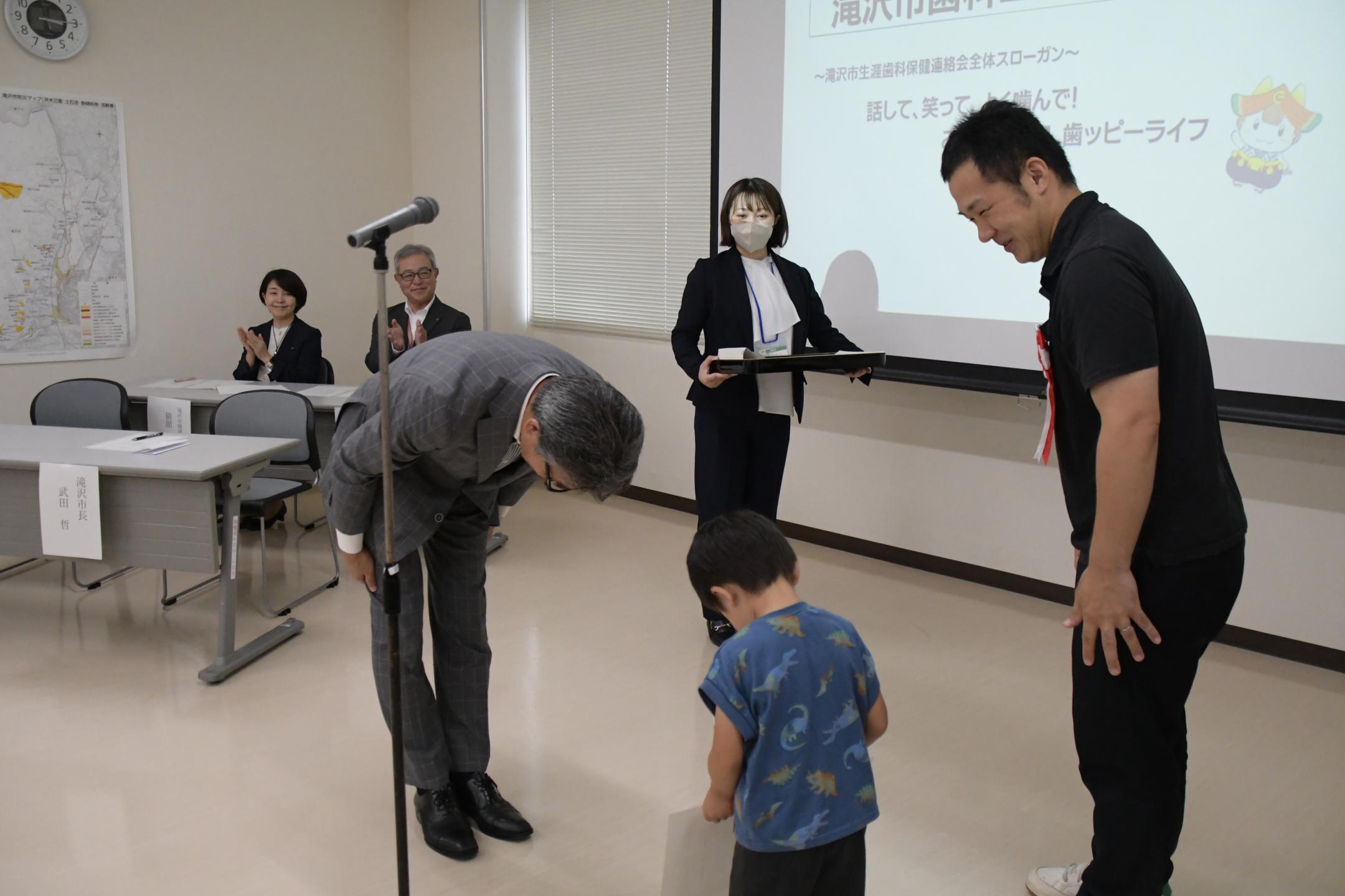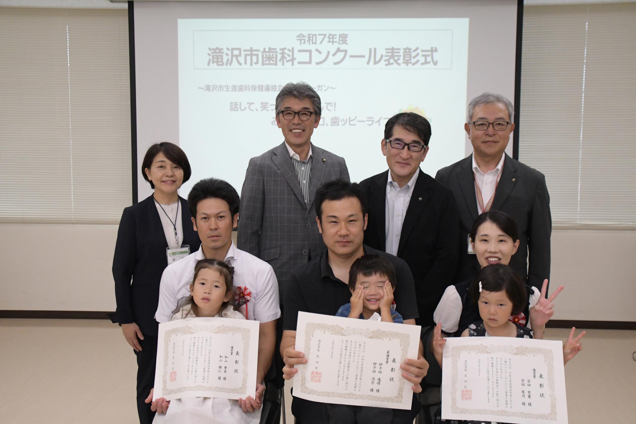 「親と子のよい歯のコンクール」では令和6年度に3歳児健康診査を受診し、虫歯が無いなど一定の基準を満たす子どもとその父母268組が対象。最優秀賞が1組、優秀賞が2組選ばれました。