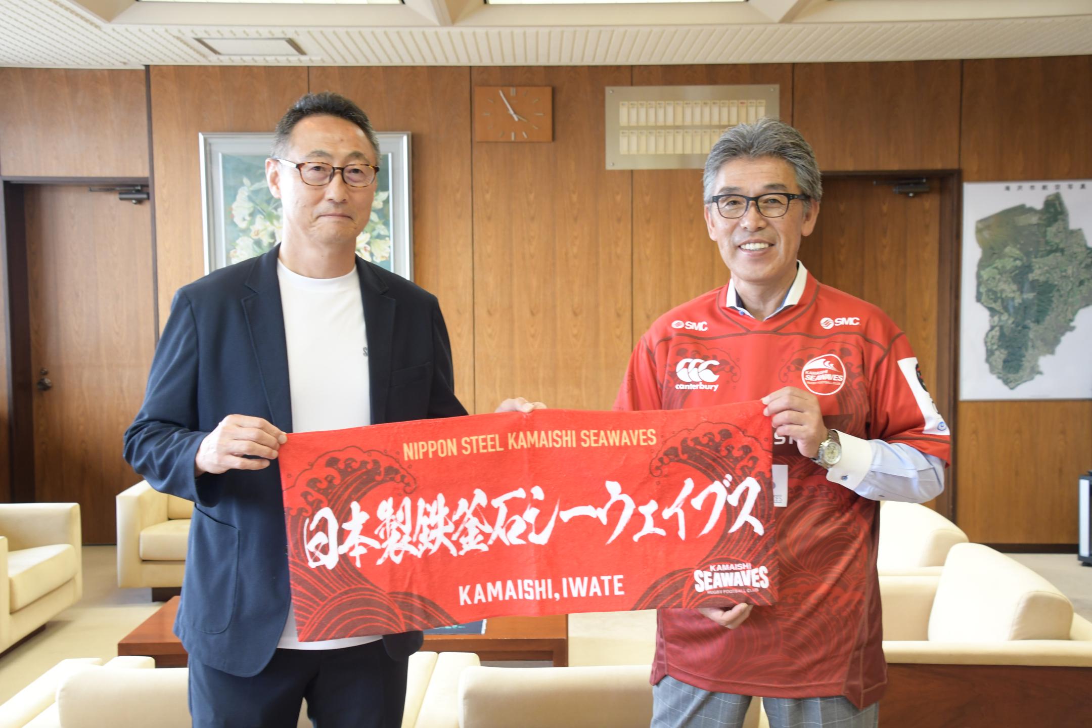 ホーム 写真で見るニュース 2025年 釜石シーウェイブス~来シーズンへの決意を表明 釜石シーウェイブス~来シーズンへの決意を表明 ページID:04703 更新日: 2025年09月11日 釜石シーウェイブスの泉秀仁(いずみひでひと)事務局長ら3人が9月1日、市長を表敬訪問しました。 当日は、2024-25シーズンの成績報告、2025-26シーズンに向けての抱負が語られました。 泉事務局長は「入れ替え戦ではD2残留となり、昨シーズンと同じ対戦カードで戦います。昨年までの経験を生かし、今年こそリーグ戦上位を目指せるよう取り組んでいきます」と決意を述べました。 (たきざわ魅力発信室作成) 前のページに戻る トップページに戻る