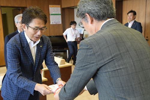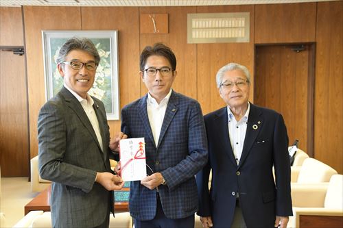 ㈱小林精機から8月20日、市に100万円の寄付がありました。これは、8月24、25の両日に開催される「滝祭2024(TAKI-SAI)」(第41回滝沢市産業まつり、第8回滝沢市商工会まつり)での活用に向けて寄付されたものです。