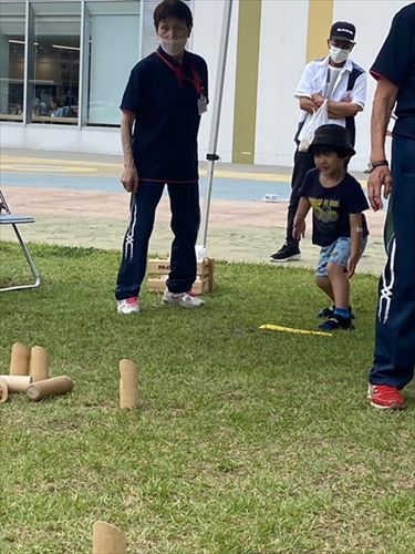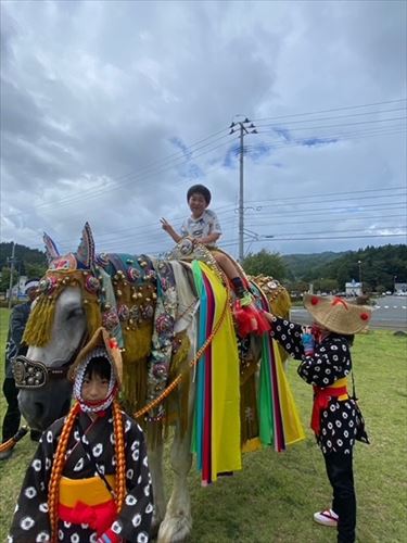 当日は、10時の開会とともに、鵜飼小学校吹奏楽団の演奏が盛大に行われ、アラジンに扮した楽団の子どもたちに観客は目を細めていました。会場には、火おこし体験や新スポーツの「モルック」の体験などのさまざまな体験コーナーやチャグチャグ馬コの係留がありました。中には馬コにまたがることができた子もおり、それぞれ思い出に残る笑顔が印象的でした。