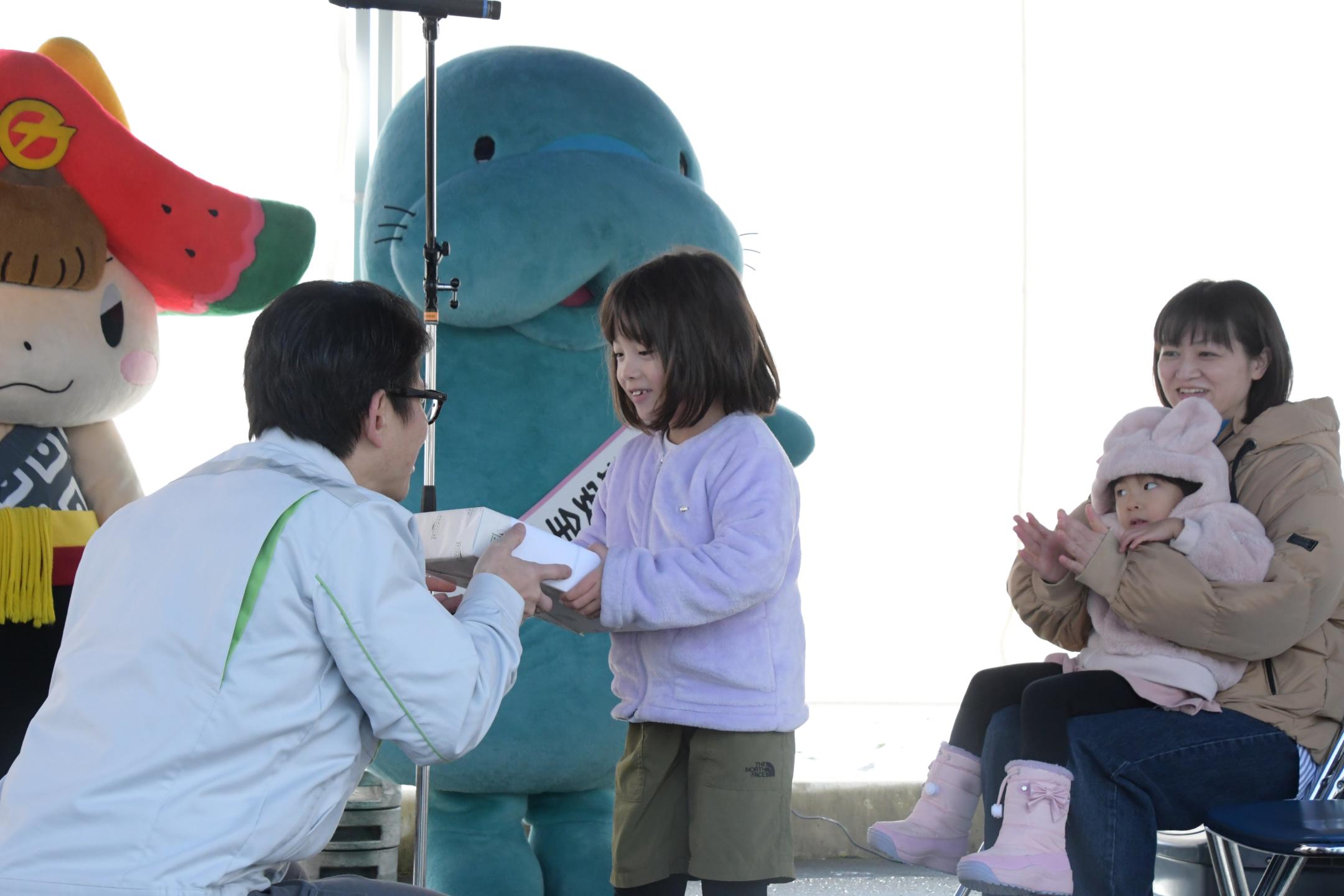 滝沢中央スマートICの利用台数が500万台を達成し、12月7日に同SIC入口で記念セレモニーを開催しました。この日の利用者で滝沢市の河野恵美(こうのえみ)さんとその家族に市とNEXCO東日本からそれぞれ記念品が贈呈されました。