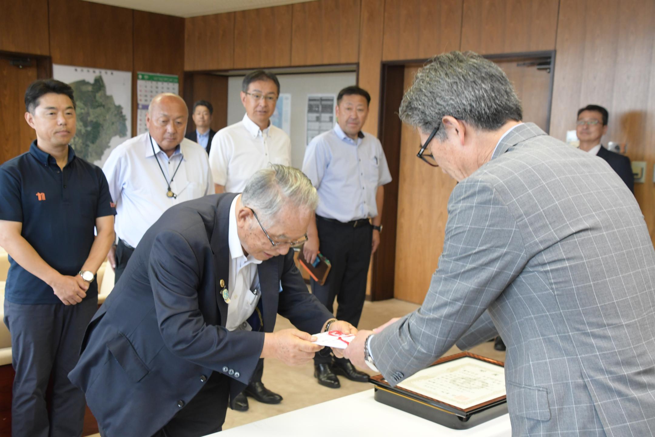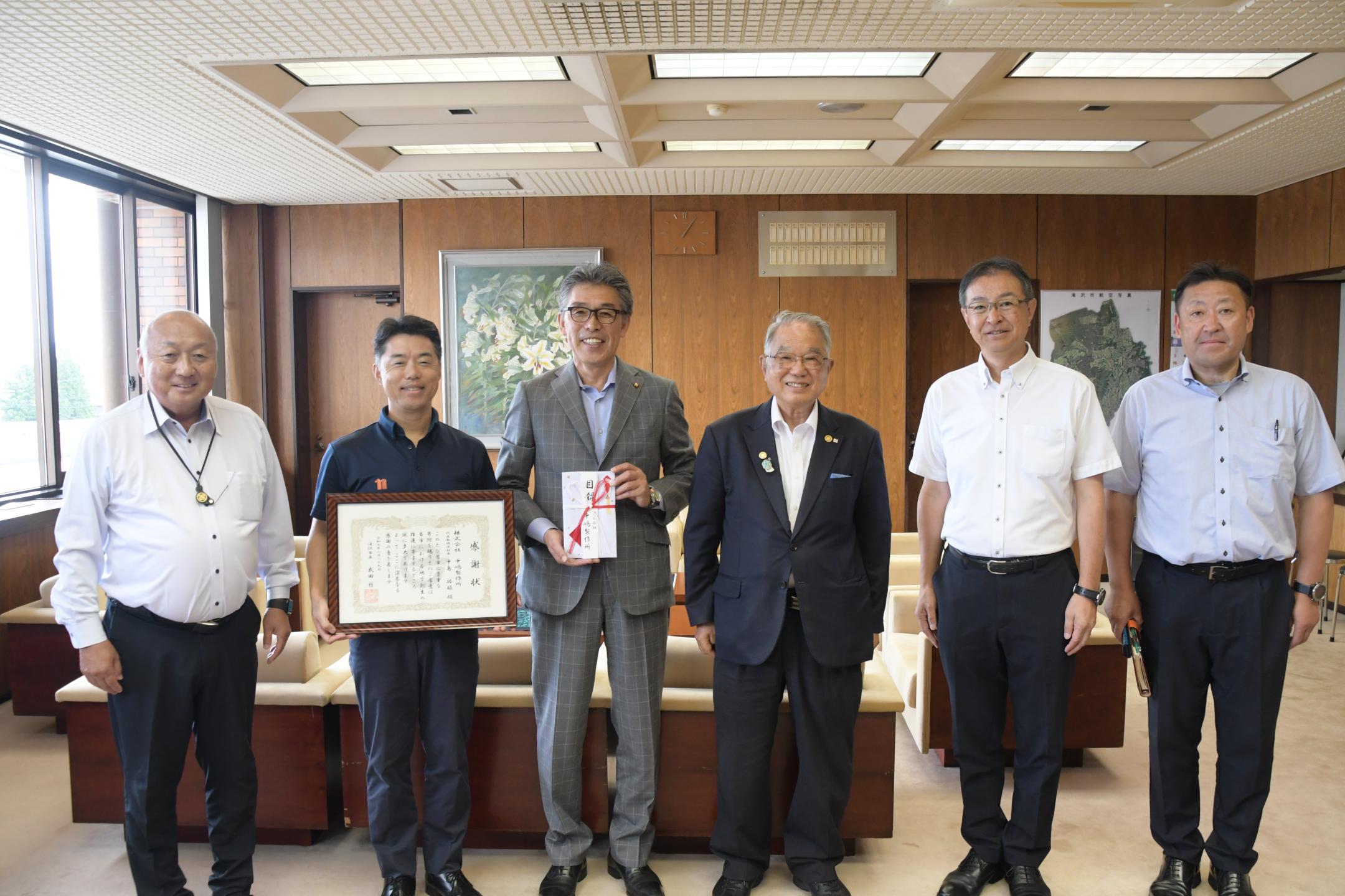 ホーム 写真で見るニュース 企業版ふるさと納税~地方創生事業推進を願って 企業版ふるさと納税~地方創生事業推進を願って ページID:04690 更新日: 2025年09月08日 企業版ふるさと納税の贈呈式が8月29日、市役所で行われました。これは、市内大崎に営業所を持つ株式会社中嶋製作所(本社:長野県長野市)から、市の地方創生事業に対し寄付があったものです。 今回の寄付は、1月に予定している子ども向け職業体験イベント事業「Out of KidZania in滝沢2026」に活用する予定です。 (地域づくり推進課作成) 前のページに戻る トップページに戻る