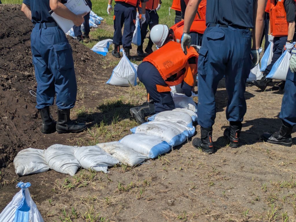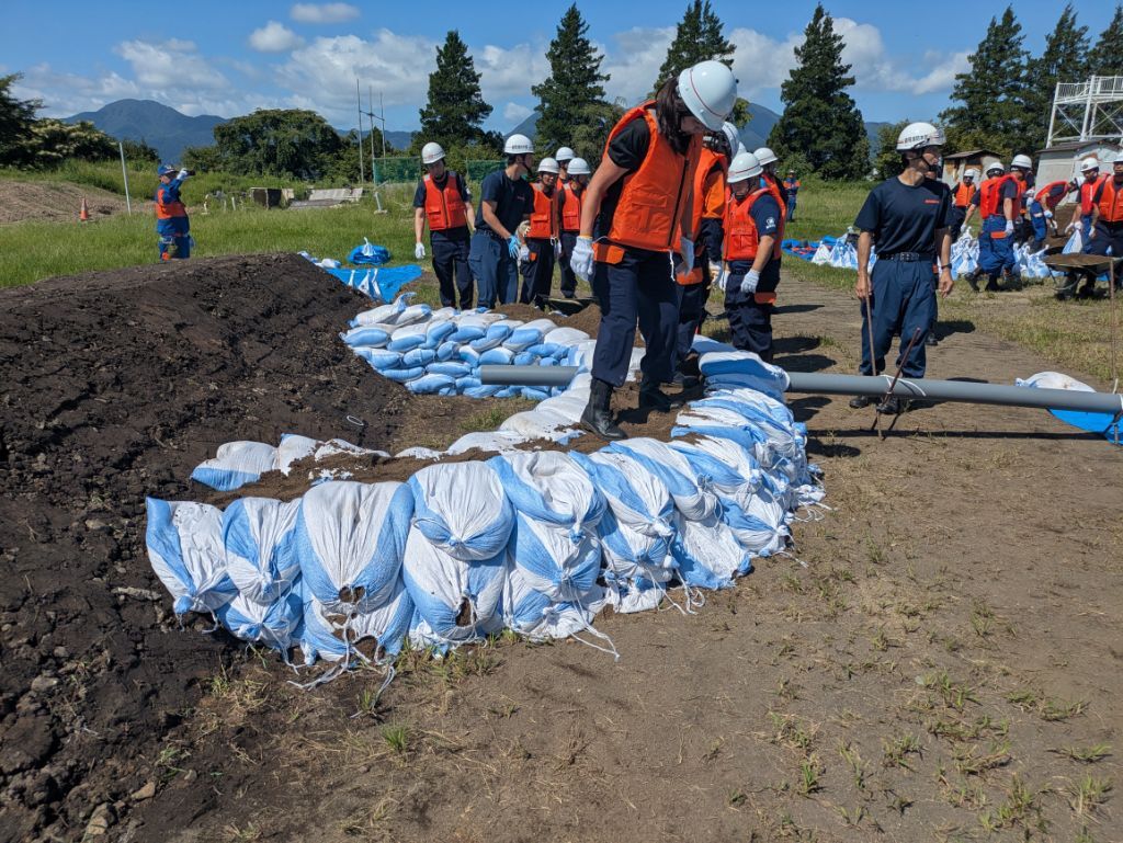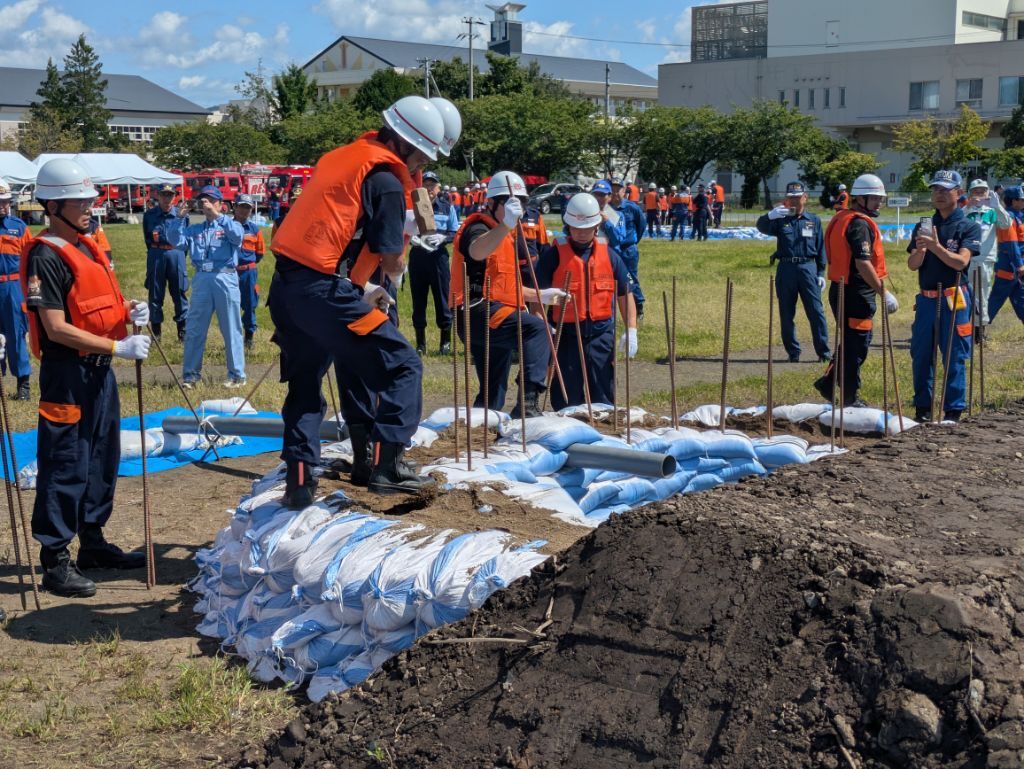 ホーム 写真で見るニュース 河川の増水に備える~盛岡地区合同水防訓練 河川の増水に備える~盛岡地区合同水防訓練 ページID:04691 更新日: 2025年09月08日 令和7年度盛岡地区合同水防訓練が、8月31日、県消防学校グラウンドで行われました。 これは、河川の増水などの災害に備え、水防体制の強化と安全確保を図り、水防団員(消防団員)の士気高揚と技術向上を目指して開催しているものです。 当日は、盛岡地区6市町の水防団員(消防団員)が各種水防工法に取り組み、水防技術の向上に努めました。 (防災防犯課作成) 前のページに戻る トップページに戻る