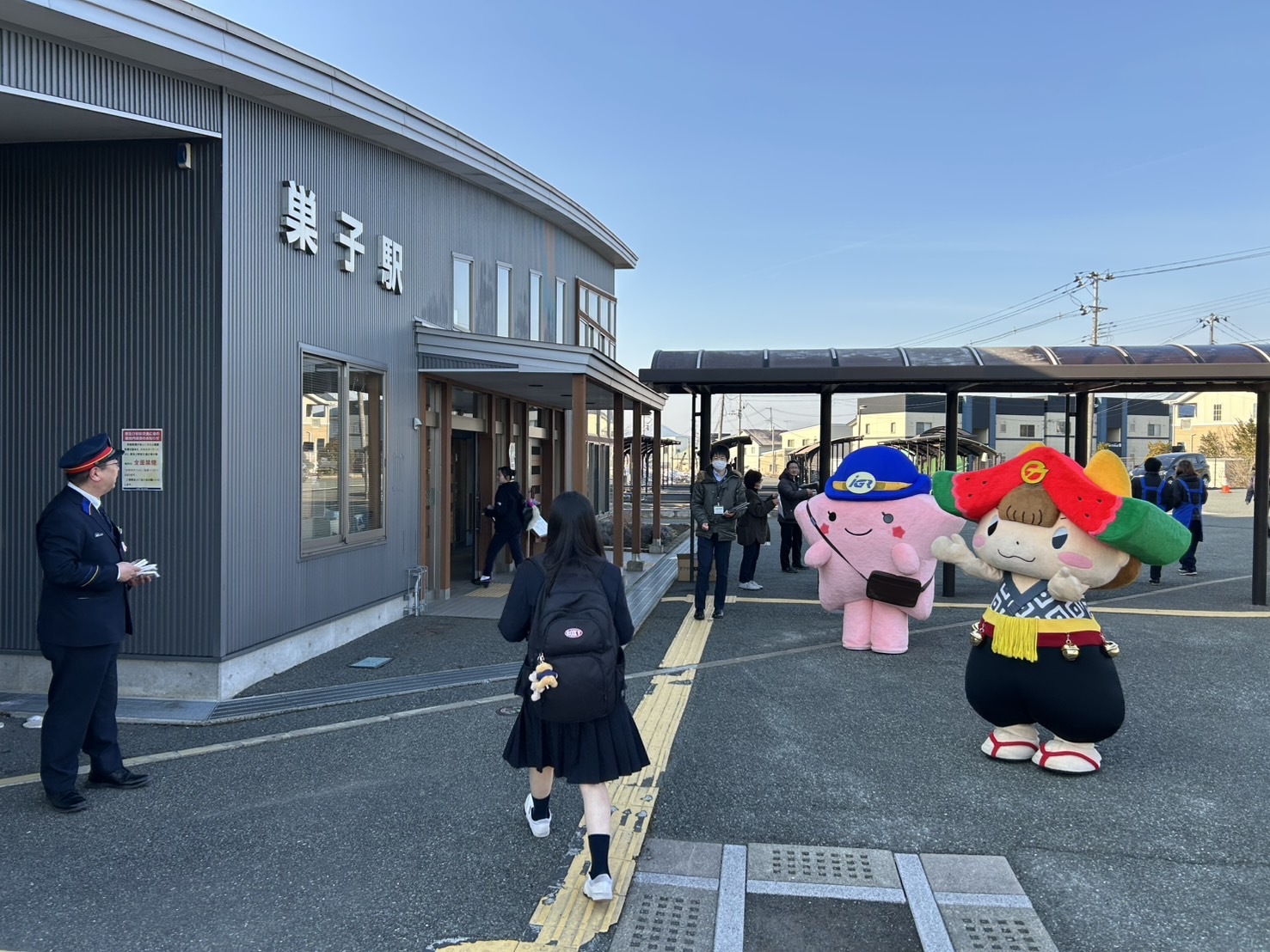 当日は、午前7時からIGRいわて銀河鉄道株式会社社員の他、巣子日曜朝市を運営する巣子振興会のスタッフなどが、開業記念デザインのポケットティッシュや市公共交通エコバッグを配りながら、利用者に日頃の感謝を伝えました。同社イメージキャラクターのきらりちゃんやちゃぐぽんも現地に駆け付け、同駅には朝から明るい雰囲気が漂いました。