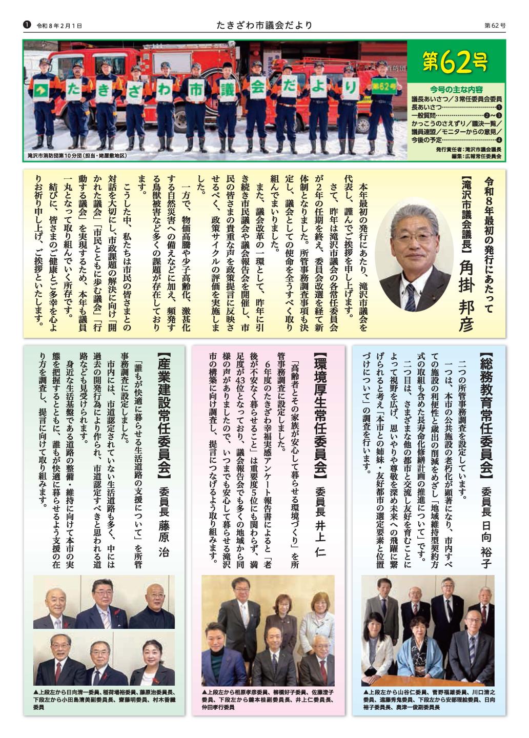 ホーム 滝沢市議会 議会活動 たきざわ市議会だより バックナンバー(令和8年発行分) たきざわ市議会だより第62号(令和8年2月1日) たきざわ市議会だより第62号(令和8年2月1日) ページID:05217 更新日: 2026年02月02日 目次 議長あいさつ/3常任委員会委員長あいさつ 一般質問 かっこうのさえずり 議決一覧 議員連盟/モニターからの意見/今後の予定 たきざわ市議会だより第62号 (PDF)[6587KB] NEW! 前のページに戻る トップページに戻る